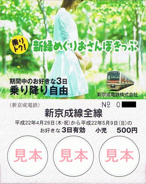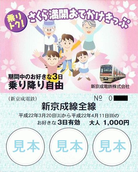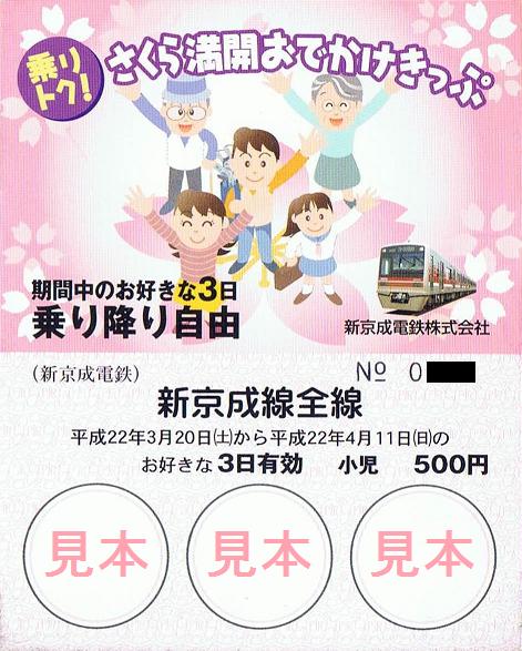平成22年3月20日から4月11日までのうち、好きな3日(連続しなくても良い)有効の企画乗車券。小児用(500円)、大人用(1,000円)ともに1,000枚限定で、松戸新田、新鎌ヶ谷、前原、京成津田沼を除く新京成線各駅で発売していました。