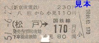 写真右は国鉄線への連絡乗車券(八柱から230円 (松戸)→国鉄線170円区間)。