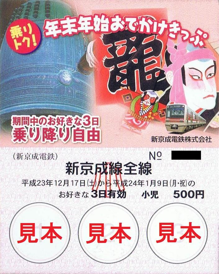 平成23年12月17日から平成24年1月9日までのうち、好きな3日(連続しなくても良い)有効。小児用(500円)は300枚限定。大人用(1,000円)は1,000枚限定で、新鎌ヶ谷、京成津田沼を除く新京成線各駅で発売していました(松戸新田、みのり台、滝不動、習志野、前原は時間限定発売)