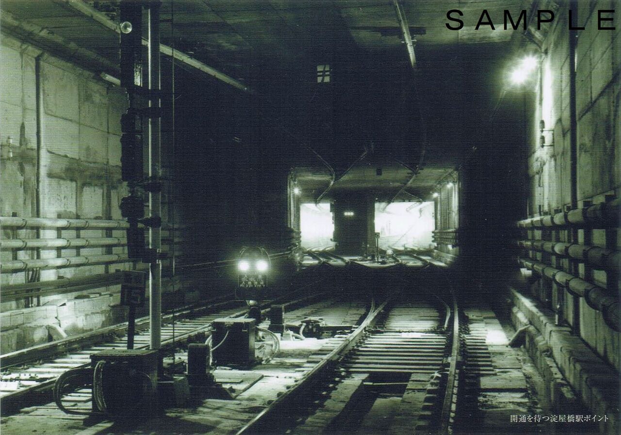 写真のポストカードは『発車式のテープカット』図柄。ヘッドマークには『淀屋橋延長線竣工』の文字。