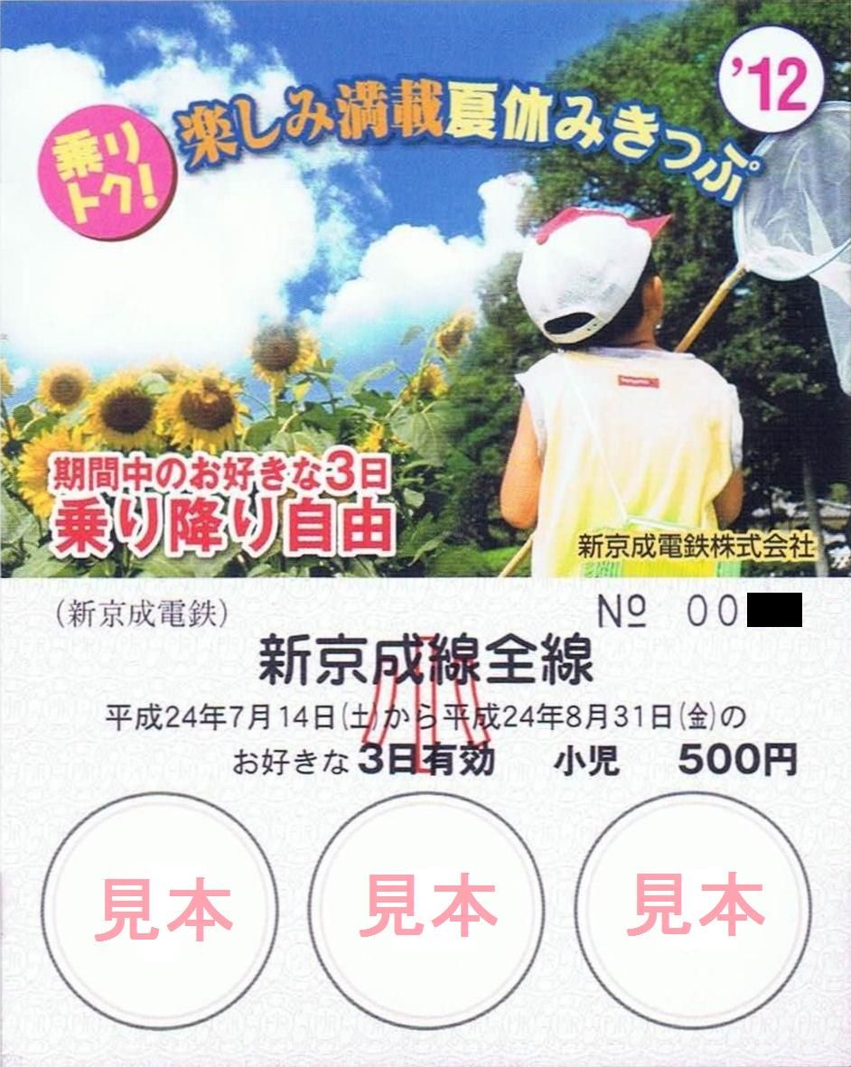 平成24年7月14日から8月31日までのうち、好きな3日(連続しなくても良い)有効。小児用(500円)は300枚限定。大人用(1,000円)は1,000枚限定で、新鎌ヶ谷、京成津田沼を除く新京成線各駅で発売していました(松戸新田、みのり台、滝不動、高根木戸、習志野、前原は時間限定発売)。