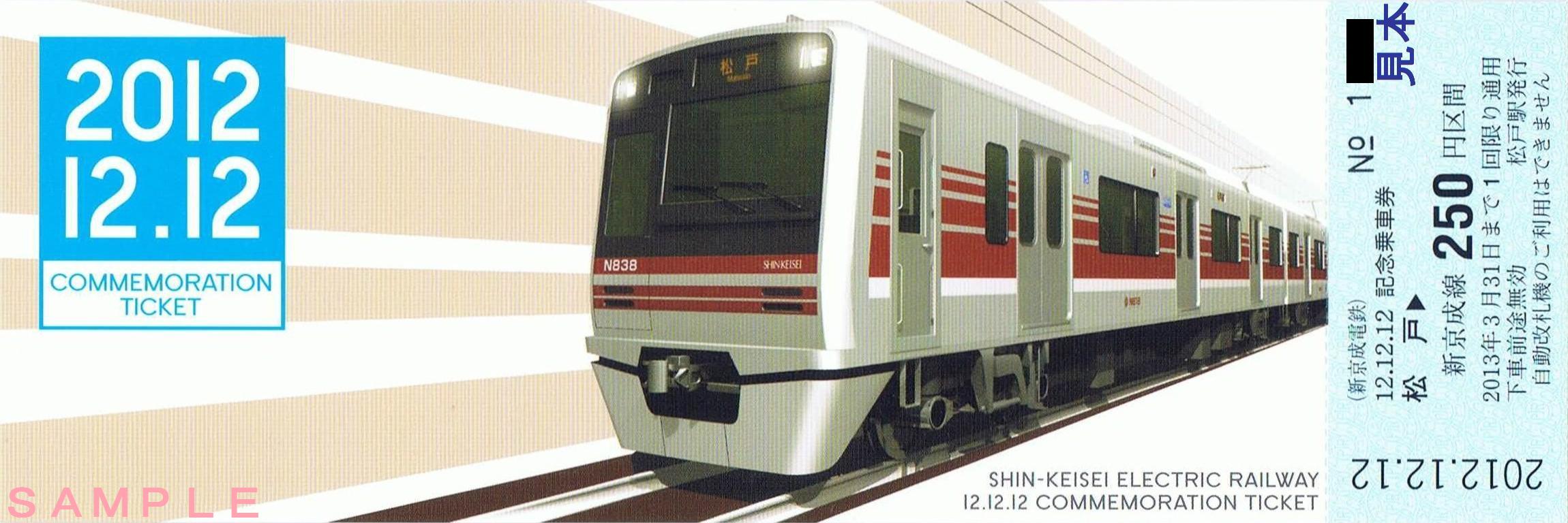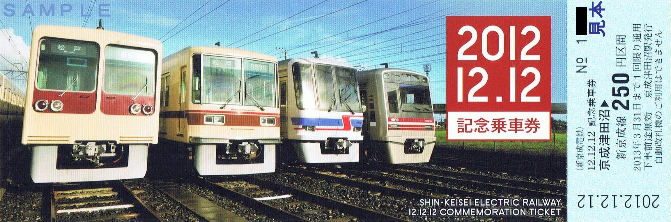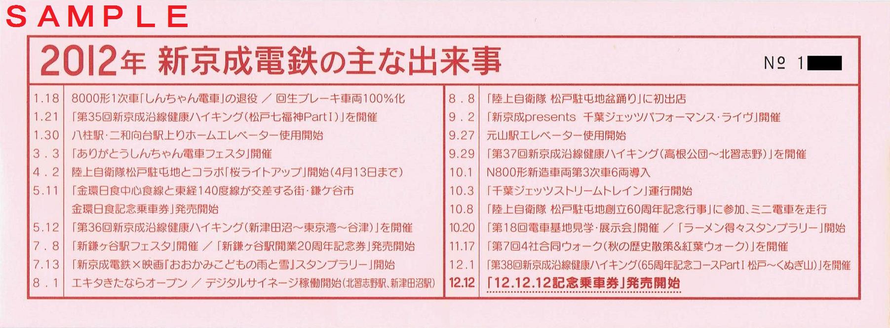 平成24年12月15日から平成25年1月6日までのうち、好きな3日(連続しなくても良い)有効。小児用(500円)は200枚限定。大人用(1,000円)は1,000枚限定で、新鎌ヶ谷、京成津田沼を除く新京成線各駅で発売していました。《12.12.12記念乗車券(平成24年12月12日発売)》
