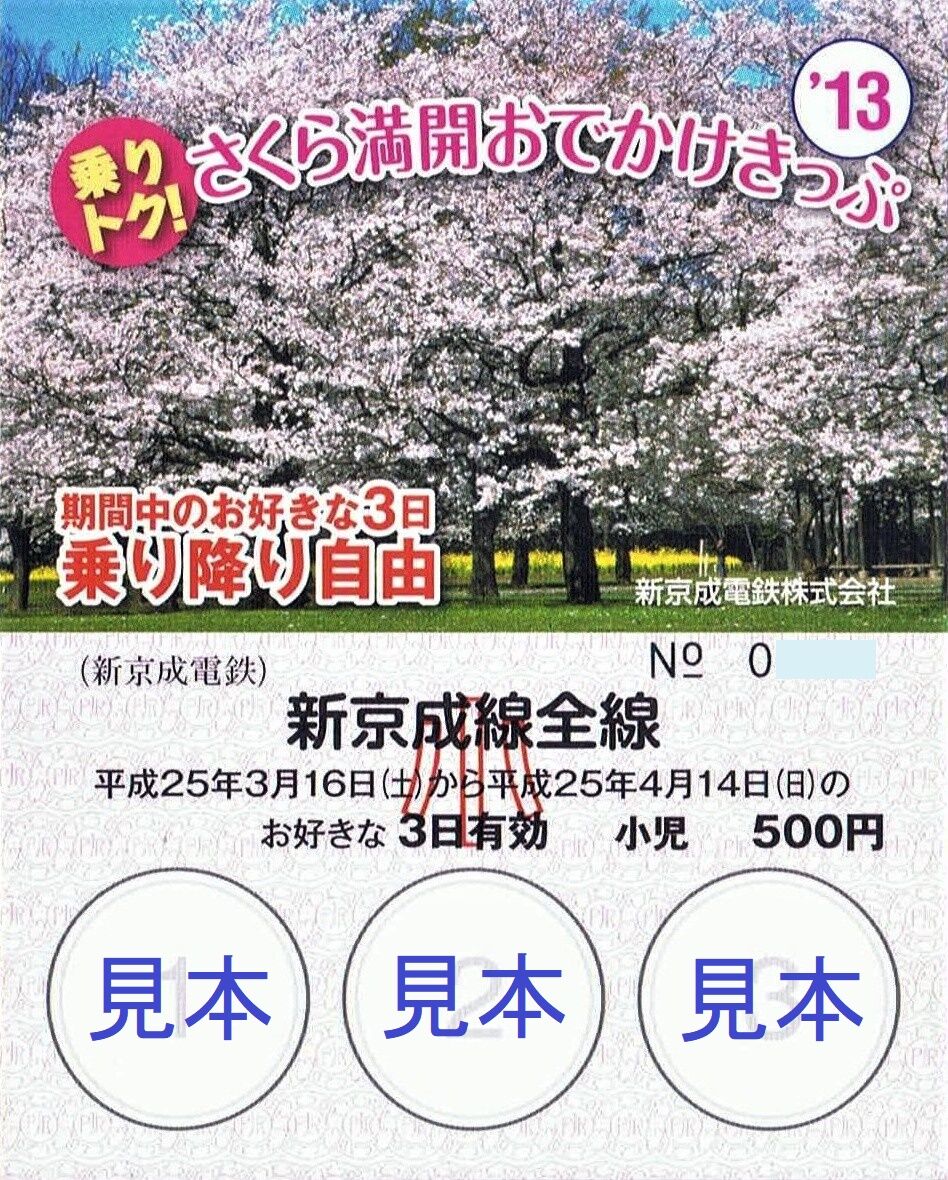 平成25年3月16日から4月14日までのうち、好きな3日(連続しなくても良い)有効の企画乗車券。小児用(500円)は200枚、大人用(1,000円)は1,000枚限定で、新鎌ヶ谷、京成津田沼を除く新京成線各駅で発売していました。写真は大人用。小児用は発行枚数が少なく、売り切れで入手に至りませんでした。――――――――――――――――――――――――――――――――――――――