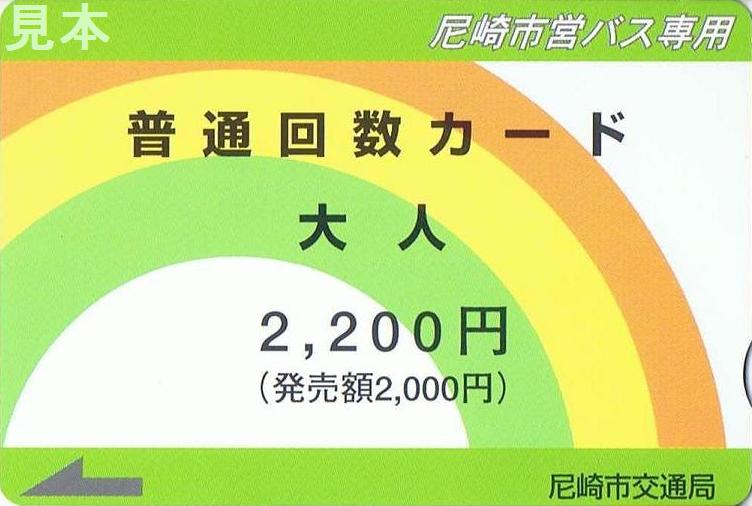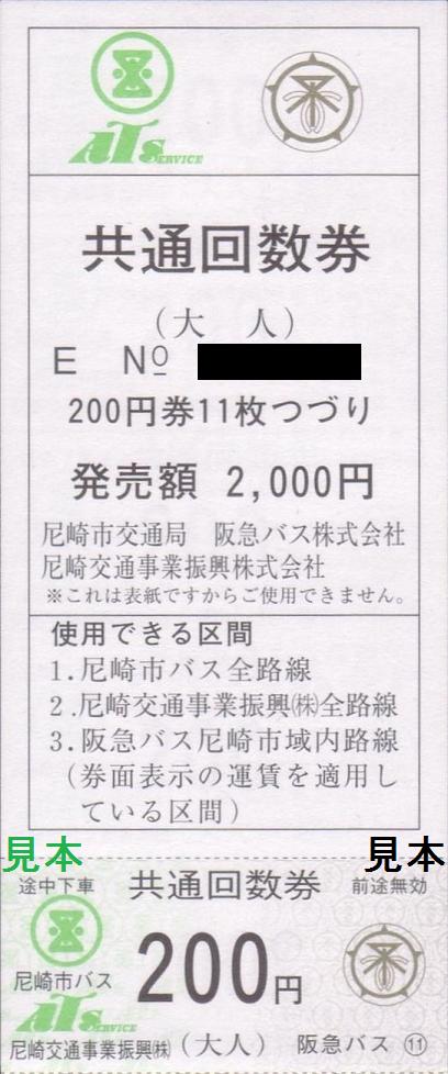 尼崎市交通局では回数券は基本的に回数カードというプリペイドカードになっていますが、阪急バスとの共通乗車用に紙製の『共通回数券』があります。写真は平成17年4月24日に市バスサービスセンター(阪神尼崎駅前)で入手したものです。