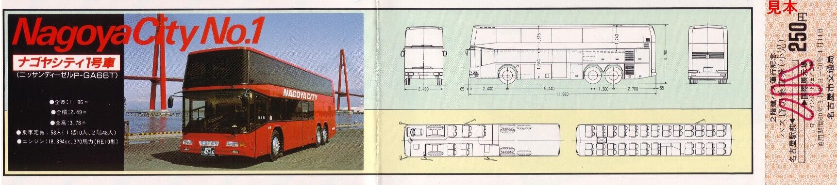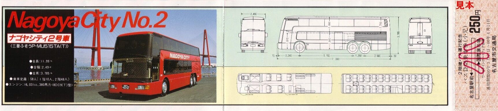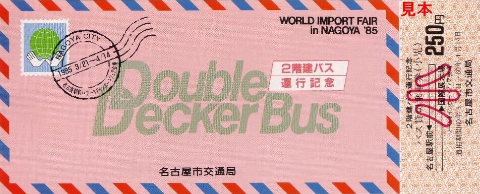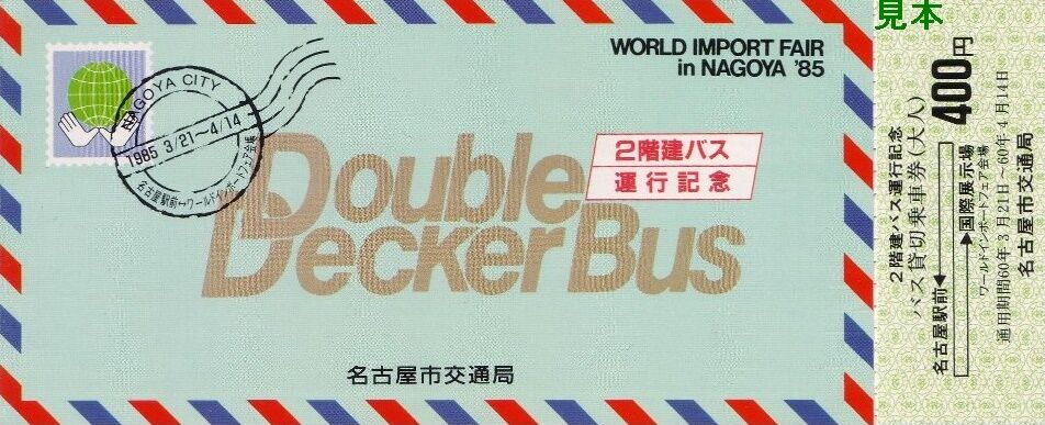 昭和60年に名古屋市の国際展示場で開催されたワールド・インポート・フェア・ナゴヤ'85(輸入博)にあわせて運行された直通バス(一般形車両)の記念乗車券です。名古屋駅前〜国際展示場間の運行で、一般型と2階建バスの2種類による運行だったようで運賃が分かれています。それぞれの券が貸切乗車券となっているのは、博覧会実施団体が名古屋市交通局に委託し運行されていたからではないでしょうか。