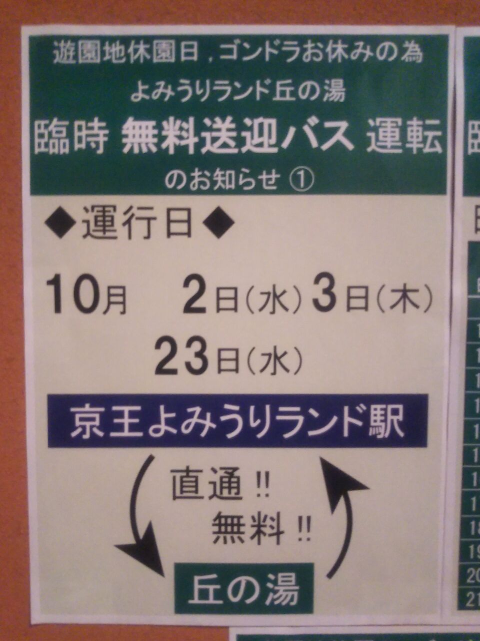 丘の湯の館内に掲示されていたよみうりランド丘の湯臨時無料送迎バスの掲示物。【関連記事】