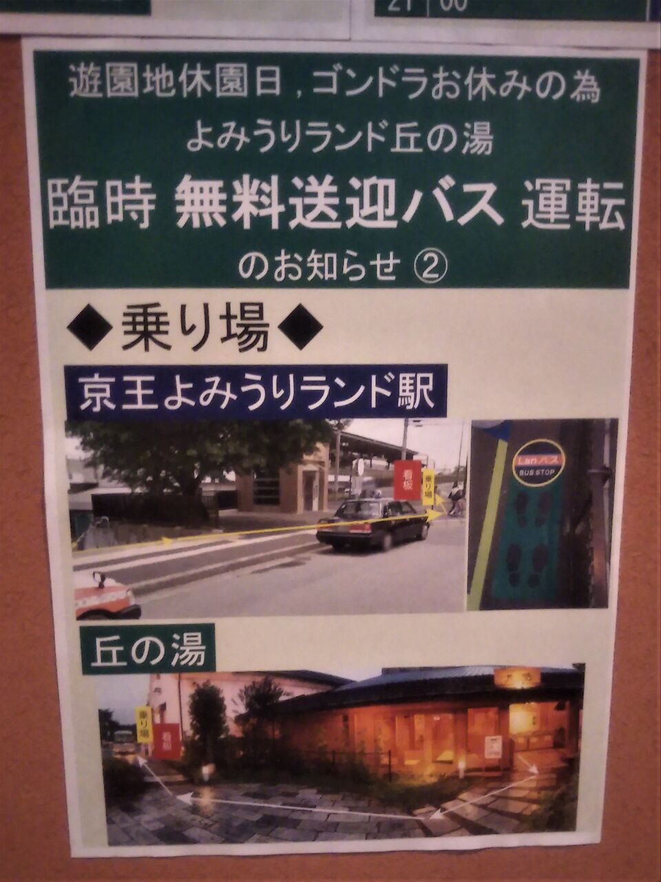 丘の湯の館内に掲示されていたよみうりランド丘の湯臨時無料送迎バスの掲示物。