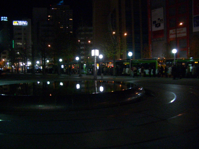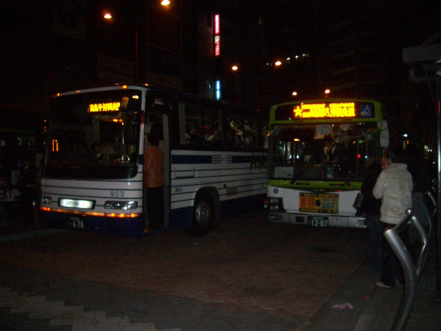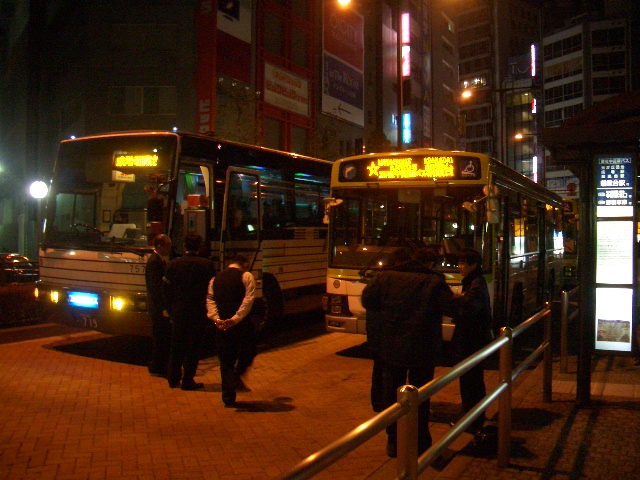 写真左は深夜急行バスの乗客の列。忘年会シーズンなので特に乗客が多かったようです。全体的にピンボケで見にくいのですが、既に廃止されている『浮間舟渡』行きのバスも写っています。