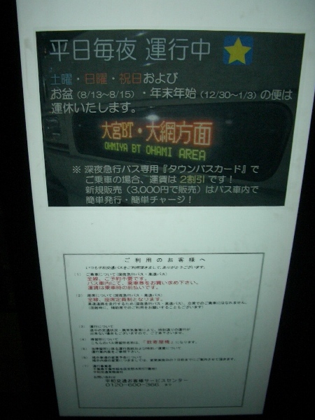 人気の秘訣は停留所を多く設置している事と、乗車時に車掌(←がいるのも凄い)が席に着いた客の降車停留所を確認し記録を取っている事。これにより寝過ごすことが無い、という訳です。実際に四街道線はバス到着時から出発時まで様子を見ていましたが40人くらいは客がいたと思います。先述のタウンバスカードを所持している客が多く、リピーターが多いのが深夜急行バスとしては珍しいと思います。