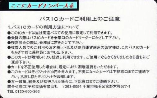 深夜急行バスを中心とした高速バス路線に平成16年からICカード『TOWN BUS ICカード』を導入しています。通常だと売価3,000円のうち500円がデポジットとなりますが、平成17年7月の外房大網線開設を記念してデポジットが期間限定で無料となっていました。