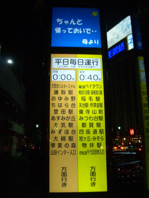 の2路線を運行していました。数寄屋橋発車時刻は当時から山田インター入口行きは0:00、四街道駅行きは0:40ですが、外房大網線については平成22年3月時点で起点が品川駅(23:30発)に延長されています。また、内房五井線と成田線が加わり、計4路線の運行となっています。