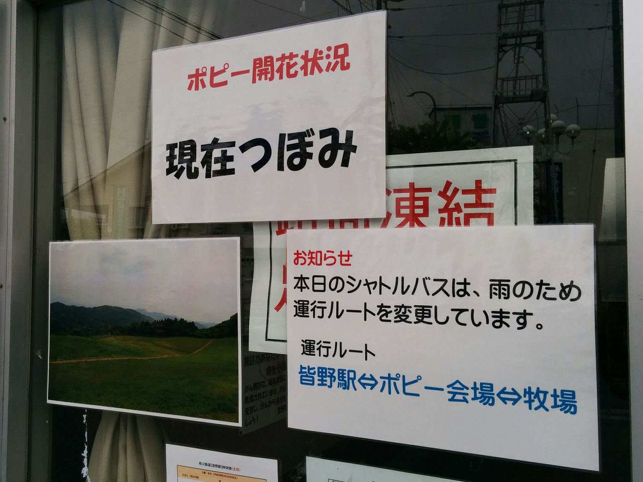 左の2点のみ2017年5月13日撮影。天空のポピーシャトルバスの起点である皆野駅前バスターミナルは、通常、皆野町営バス日野沢線・金沢線、西武観光バス三沢線が発着しています。撮影日は雨天のため、午後の天空のポピーイベントおよびシャトルバス運行は中止となりました。この時点でポピーの開花状況はつぼみ。