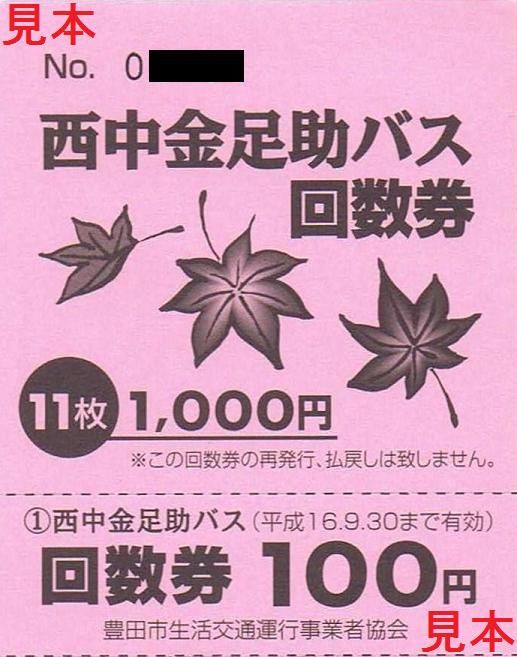 券面に『平成16.9.30まで有効』と記載されていますが、西中金足助バス運行開始当初は、平成16年9月30日までを予定として名鉄三河山線猿投~西中金間に沿線自治体が赤字補填を行っていたためです。結局は予定より早く廃止されました。