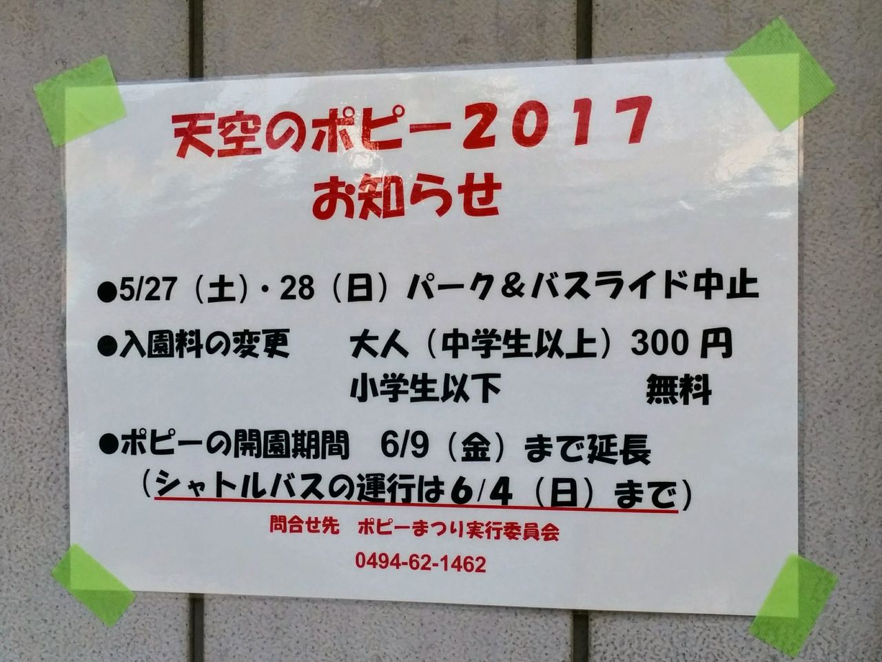 なお、2017年は5月13日から6月4日までの開催予定でしたが、ポピーの開花が遅く、入園料(平日大人500円・子供300円、土休日大人600円・子供300円から大人300円・子供無料)やシャトルバス(往復100円から無料)の料金等が変更。開催期間が6月9日まで延長となっています(シャトルバスは6月4日で終了)。