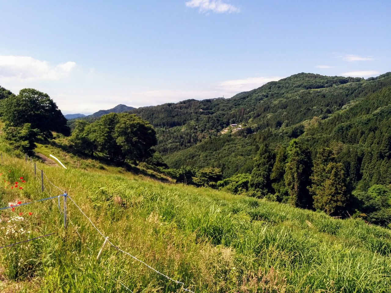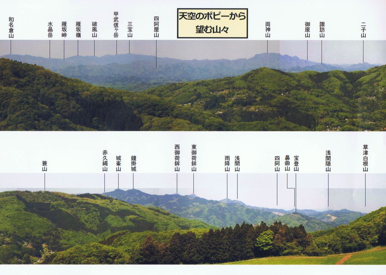 写真左はポピーまつり実行委員会のリーフレットです。裏面にシャトルバスに関する記載あり。なお、6月3日配布時点で、入園料・シャトルバス料金は変更前(当初の予定)のものから訂正されていません。若干、イベント内容等の変更に関するお知らせが不足していたものの、天空のポピーから望む山々(写真右)の様なしっかりした印刷物が用意されており、シャトルバスの案内から会場内にかけて、すごく案内が丁寧だと思いました。この他に天空のポピー関連のリーフレットは西武鉄道発行のものがありました。