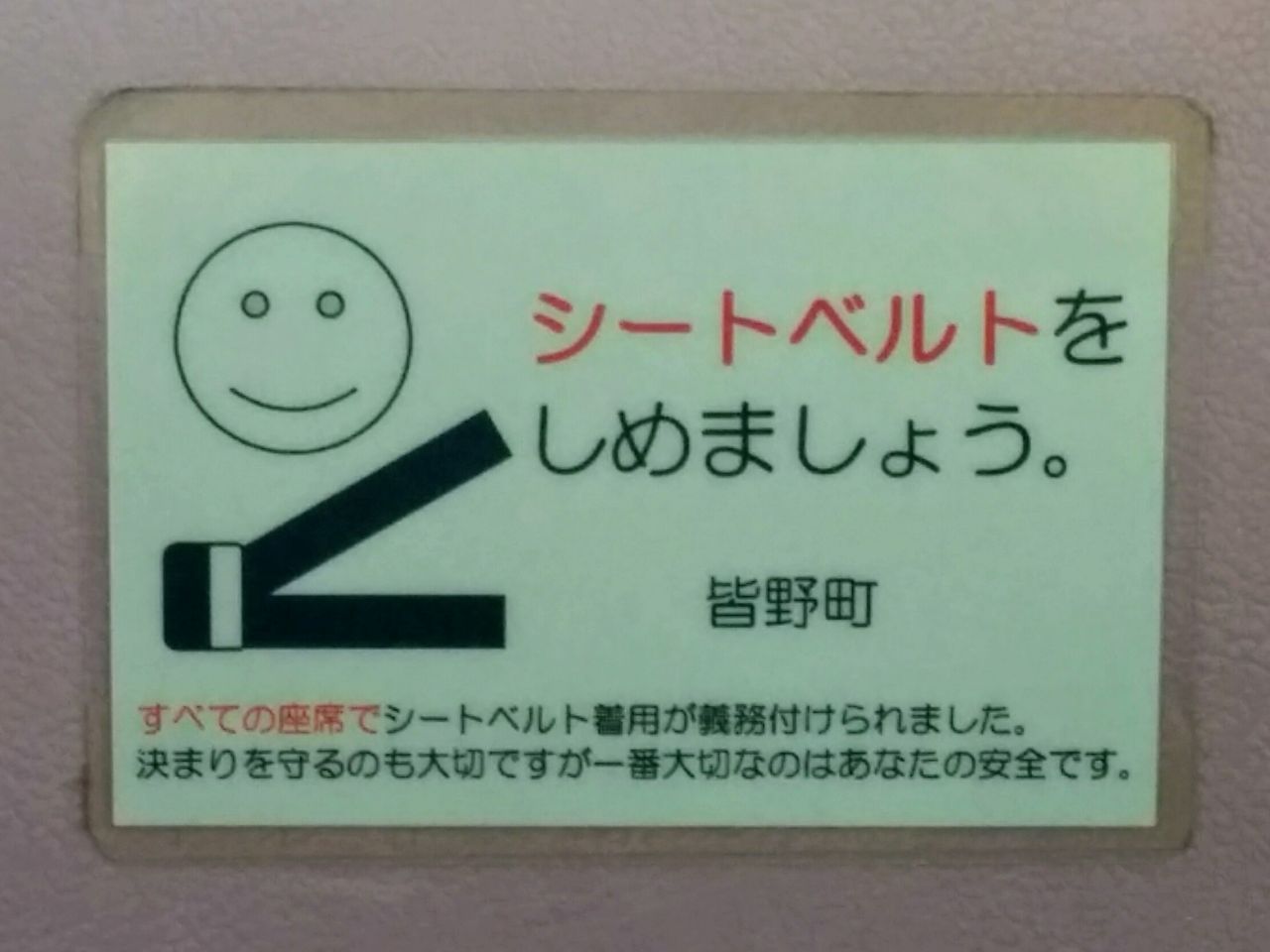 写真右は座席前方に掲示されているシートベルト着用の案内。皆野町民でなければなかなか乗車する機会が無いバスなので撮影しておきました。もっと車内を撮影すればよかったかも。