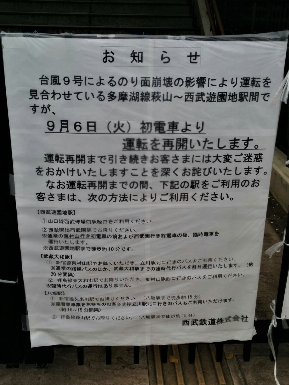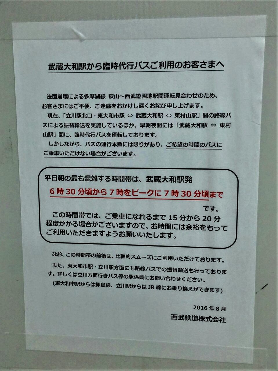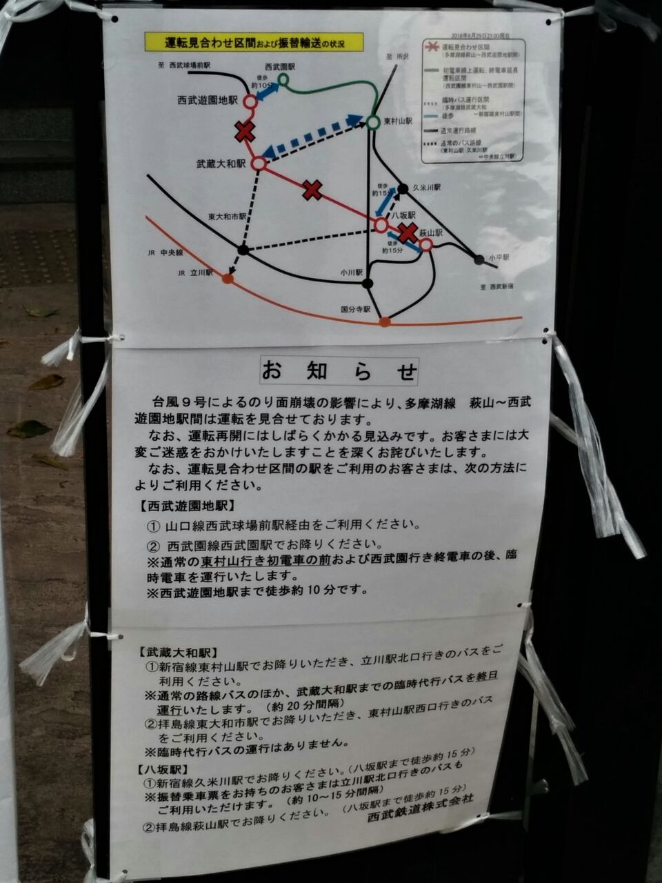 2016年8月22日に発生した武蔵大和〜西武遊園地間の法面崩壊により、同年9月5日まで西武鉄道多摩湖線萩山〜西武遊園地間が運休となりました。西武バスへの振替輸送以外に、復旧工事期間中には東村山〜武蔵大和間の臨時代行バスが運行されました。運行は西武バスおよび西武観光バスにて行われました。