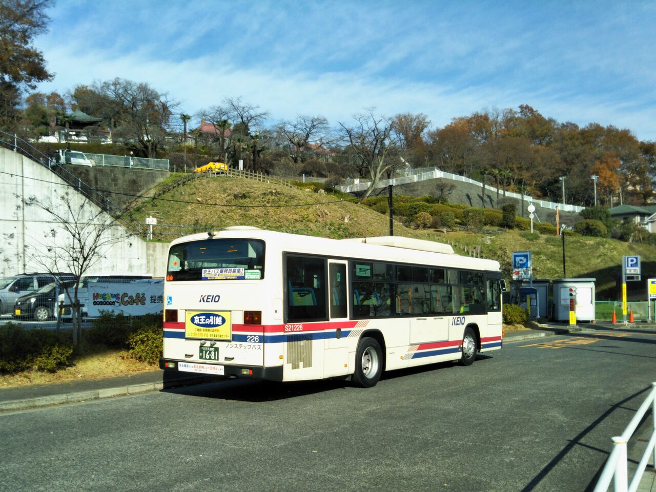 こちらは京王バス担当便でS21226号車。写真左は高幡不動駅臨時バス乗り場にて。駅舎前のバス降車場付近。写真右は多摩動物公園駅停留所にて。