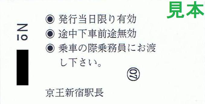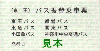 京王バス・東急バス・小田急バス・都営バス・関東バス・神奈川中央交通バスに対応したA型『KEIO』黄緑色地紋です。写真は、表面と『京王線新宿』『新線新宿』発行分の裏面。