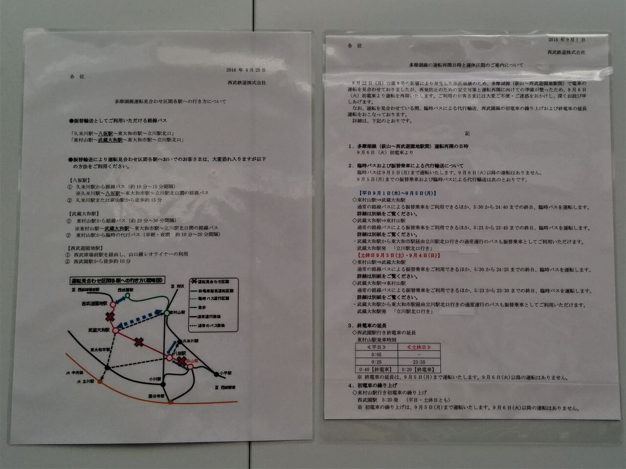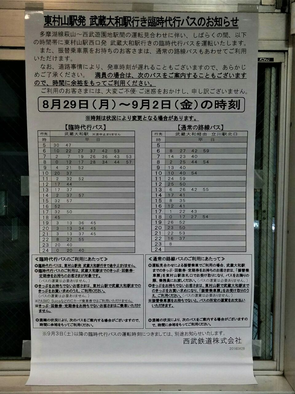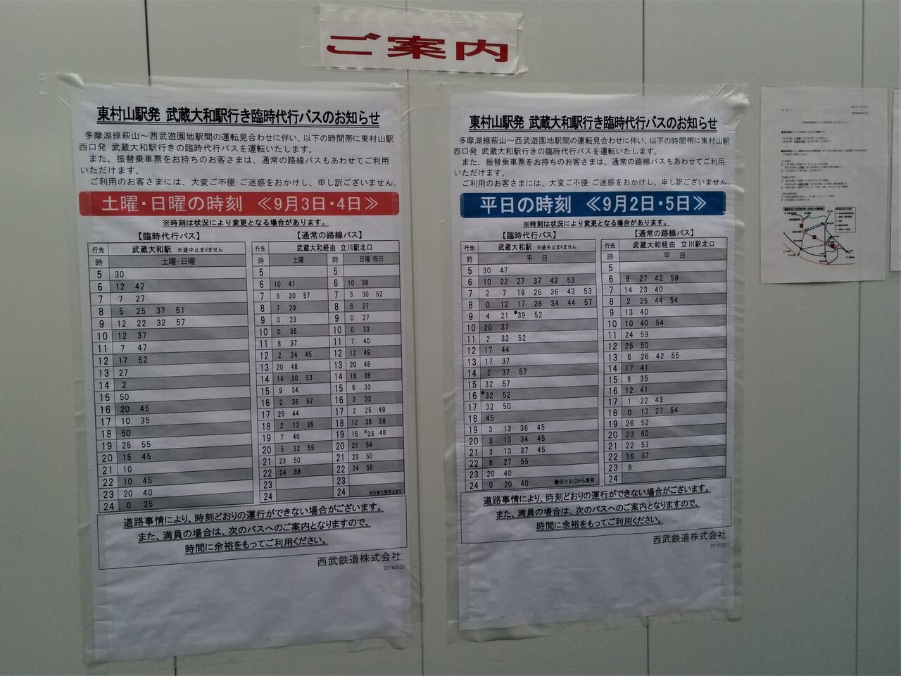 写真左は東村山駅に掲示された臨時代行バス時刻表で土日ダイヤと平日ダイヤ(9月2日からの増便に対応した改定版)。
