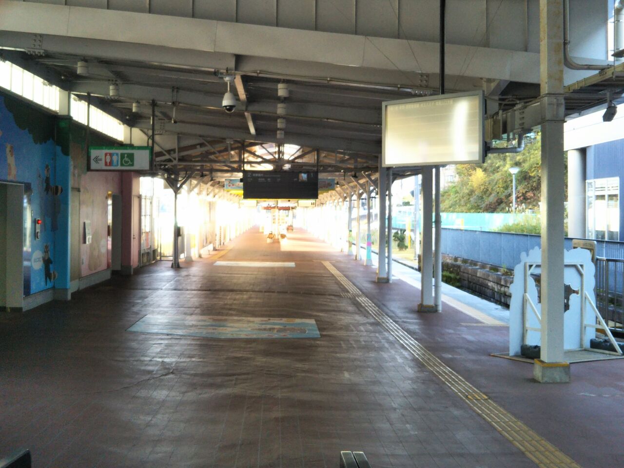 写真左は多摩動物公園駅自動券売機前の掲示物。写真右は改札内。自動改札は進入出来ない様になっており、ホーム上の案内表示も非表示となっていました。【関連記事】