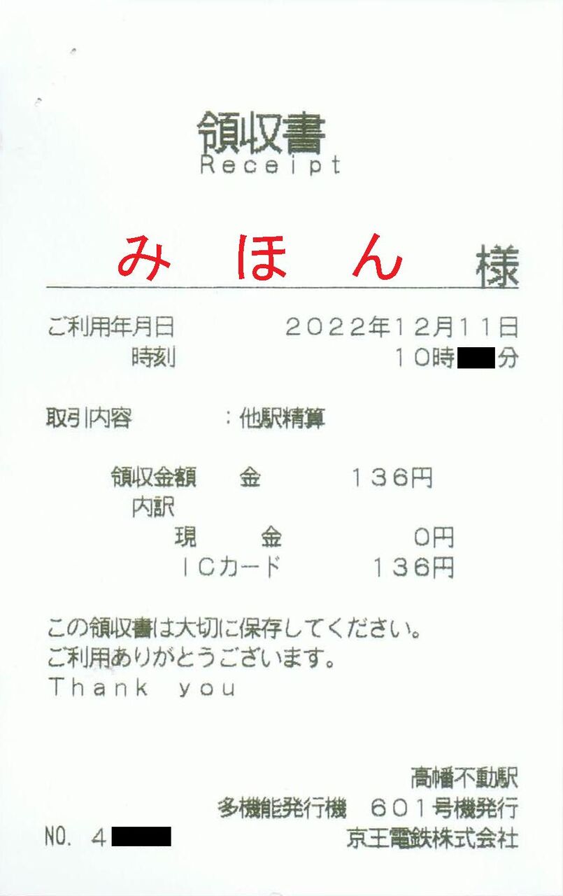 先述のお知らせ裏面に『あらかじめ、ご乗車区間のきっぷをお買い求めの上』との記載がありますが、京王線高幡不動駅まで交通系ICカードを利用し、多摩動物公園駅まで継続して京王電鉄を利用する客については、高幡不動駅有人改札にて多摩動物公園駅までの運賃を精算した上で写真の領収書と『PASMO・Suica処理連絡票』を発行し、代替乗車票とこれらの計3枚をステープラ留めにして渡していました。代行バス・多摩都市モノレールの多摩動物公園駅下車時に回収されます。なお、『PASMO・Suica処理連絡票』については『〔動物園線架け替え工事〕』や日付等が予め印刷されたもの(おそらくコピー製)が用意されていますが、下部に『禁改変』の記載があるため当ブログでは掲載を控えます。