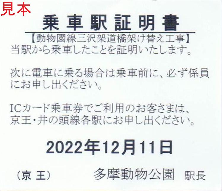 代行バス乗り場で代替乗車票を所持していない利用者に配布されたC型サイズの証明書。井の頭線下北沢駅付近橋りょう架け替え工事の際に発行されたものとほぼ同じ様式です。《多摩動物公園駅》