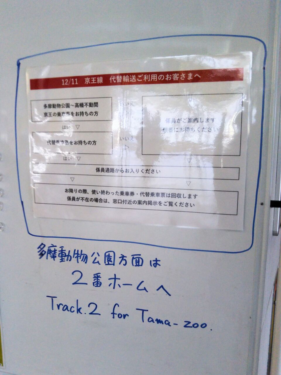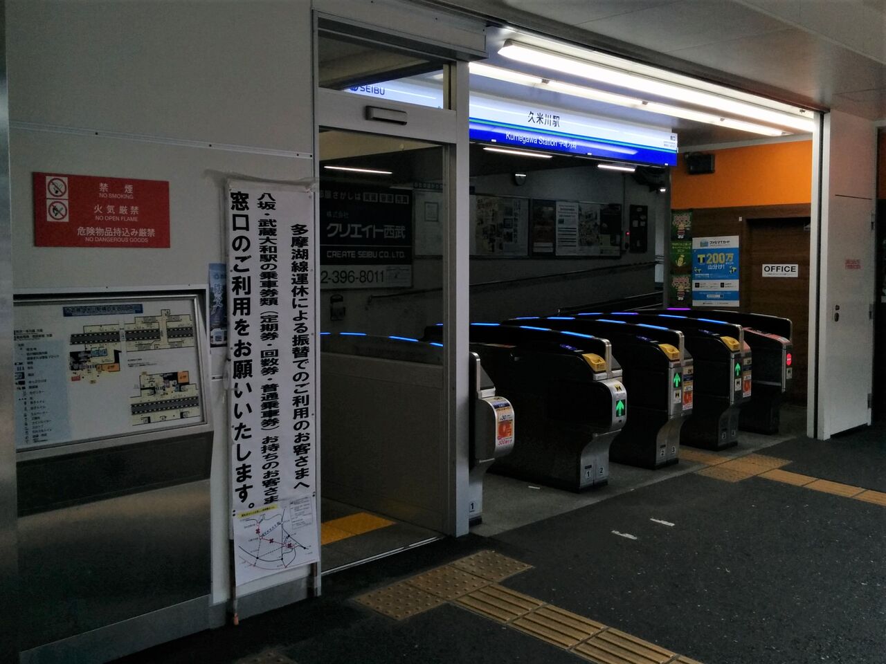 多摩湖線の運休は割と長い間実施されました。そのため、振替輸送対象となる路線バスが発着する駅では専用の掲示物や看板が多数掲出されていました。写真は新宿線久米川駅改札前の振替輸送利用者向けに窓口利用を促す看板。