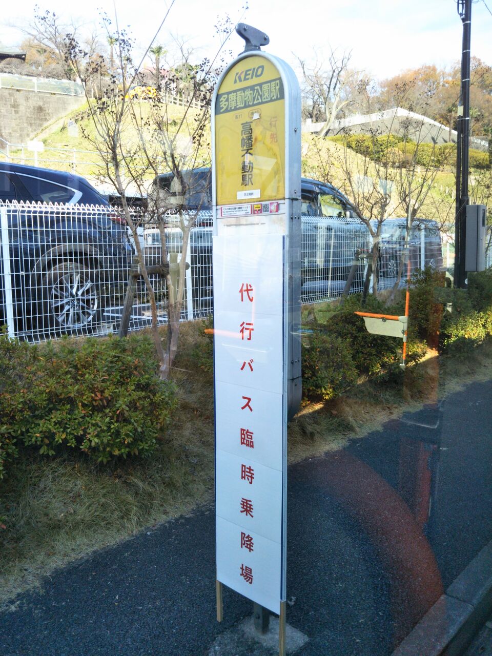 写真左は多摩動物公園駅停留所(代行バス乗り場)で、土曜日のみ運行される京王電鉄バス動物園線(高幡不動駅〜多摩動物公園駅)の停留所を使用しています。