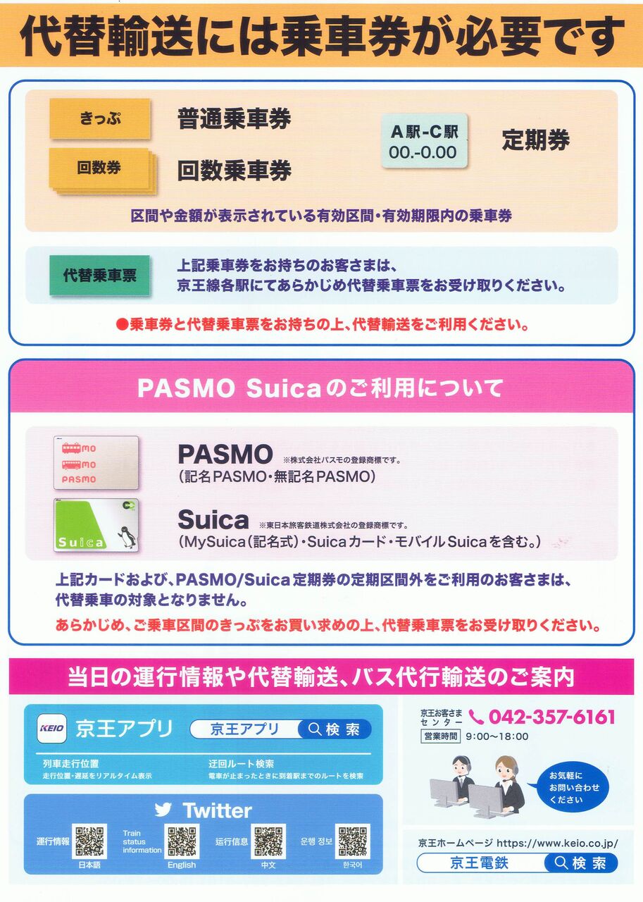 京王電鉄の駅で運休前から配布されていたA4サイズ・両面印刷のお知らせの表面と裏面です。