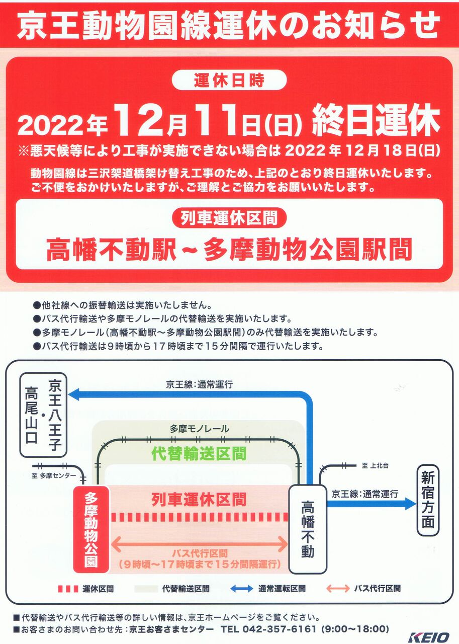 2022年(令和4年)12月11日、京王電鉄動物園線は川崎街道と交差する三沢架道橋の架け替え工事に伴い終日運休となりました。代行バスの運行が行われた一方で、今回は他社線への振替輸送は行わず、始発から最終までは多摩都市モノレール(多摩モノレール)高幡不動駅〜多摩動物公園間に限定した代替輸送を実施しました。