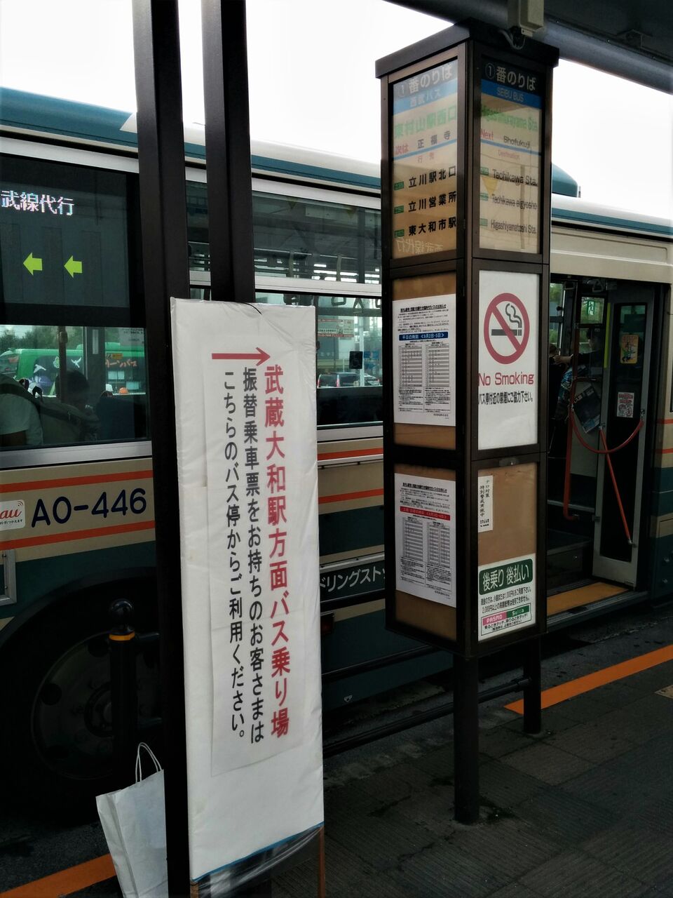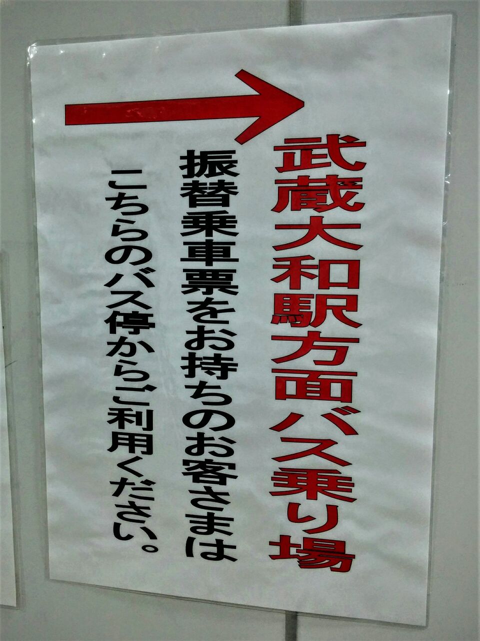 武蔵大和駅では駅舎入口が封鎖されており、券売機が稼働していない影響か、乗車券を所持しない代行バスの乗客には機械発券の乗車駅証明書が渡され、着駅で精算する仕組みになっていました。======================================