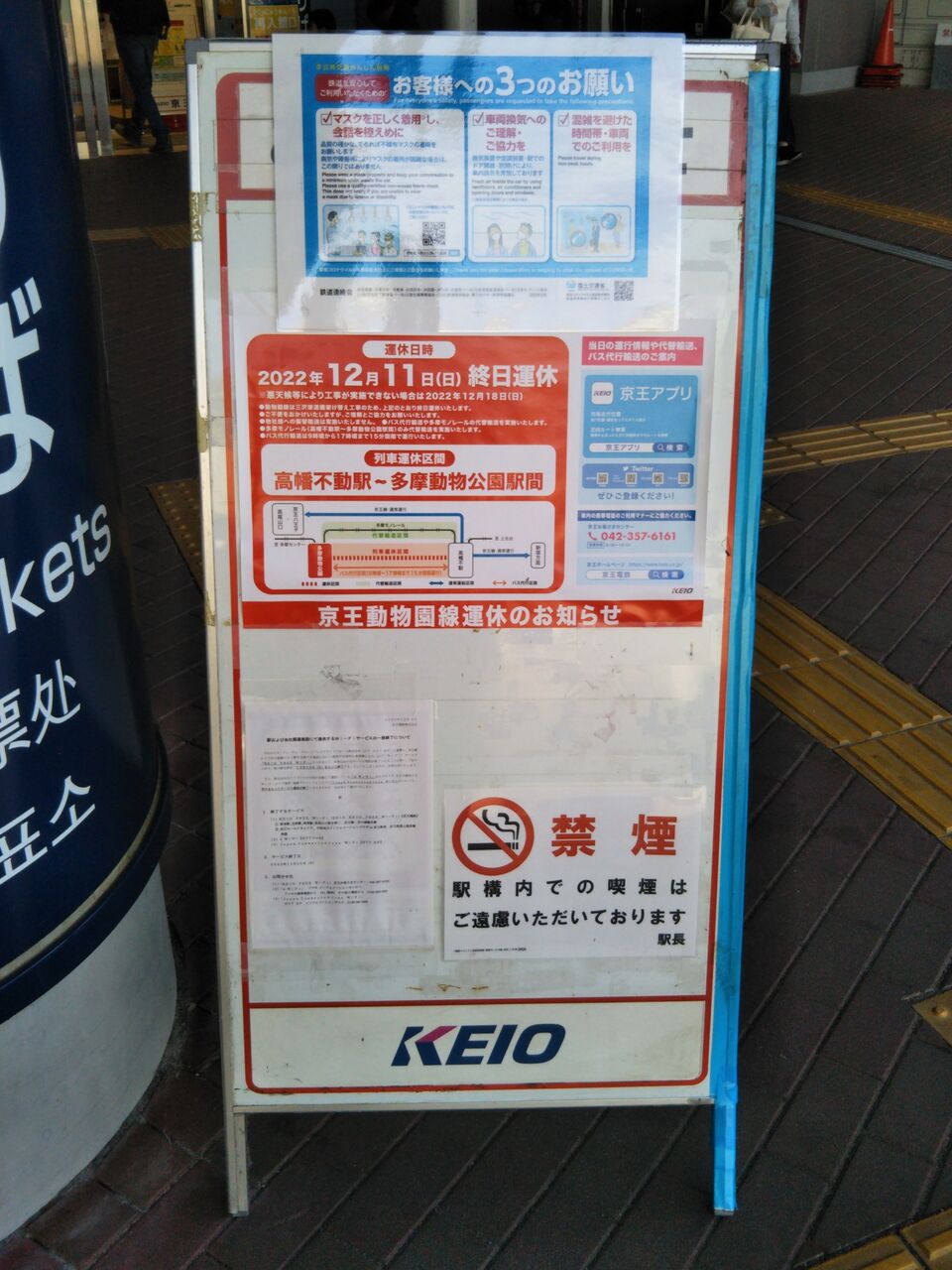 写真左は多摩動物公園駅自動券売機前の掲示物。写真右は改札内。自動改札は進入出来ない様になっており、ホーム上の案内表示も非表示となっていました。