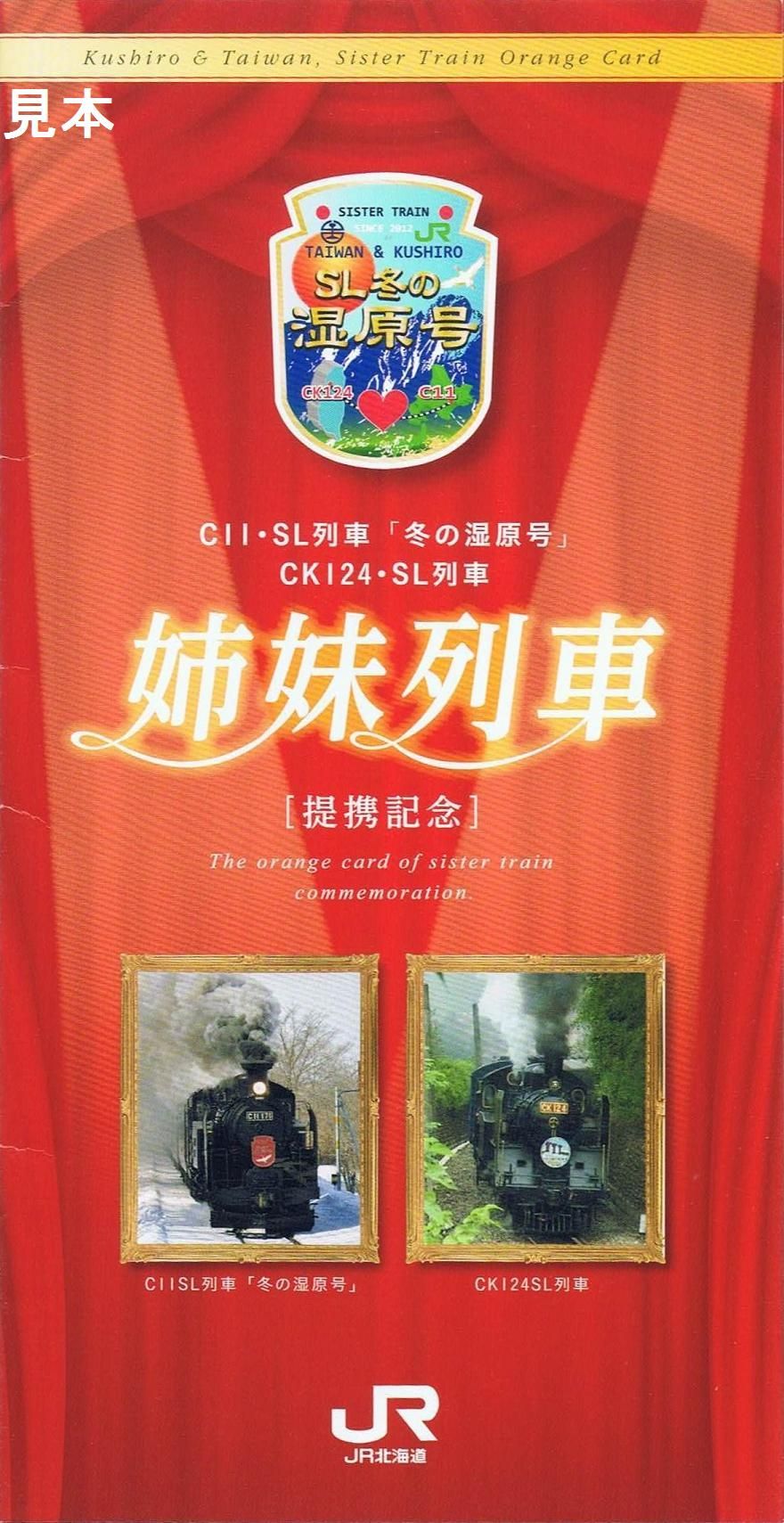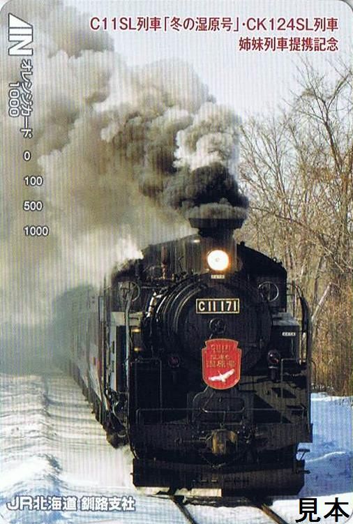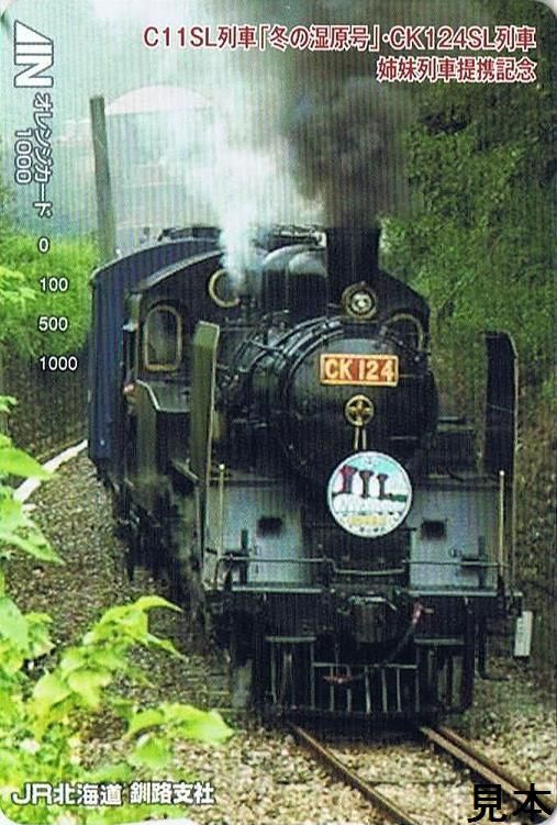 平成24年3月にCK124・SL列車とJR北海道が釧網本線で運行しているC11・SL列車「冬の湿原号」が姉妹列車提携を結んだ記念のオレンジカードです。平成24年3月26日発売開始。