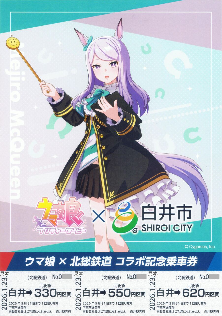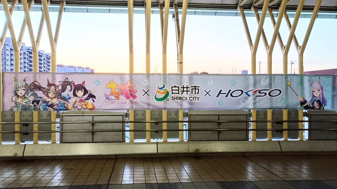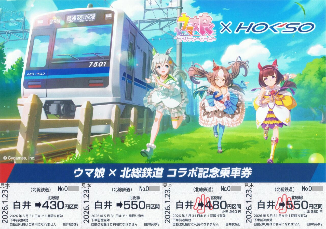 北総鉄道と白井市は2026(令和8)年1月23日よりクロスメディアコンテンツ『ウマ娘 プリティーダービー』とのコラボレーション企画第2弾を北総線白井駅および白井市で実施しています。北総鉄道関連のイベント内容はオリジナルコラボヘッドマーク付き広告ジャックトレイン(北総鉄道7500形使用。北総線・京成線・都営浅草線・京急線)の運行、白井駅装飾、記念乗車券・コラボグッズの発売、スタンプラリーです。この他に白井市内の指定店舗でのトレーディングカード配布、等身大パネルの設置を実施しています。