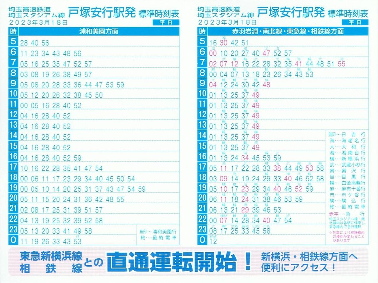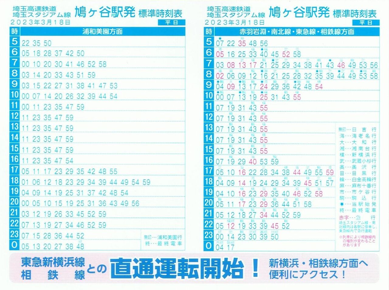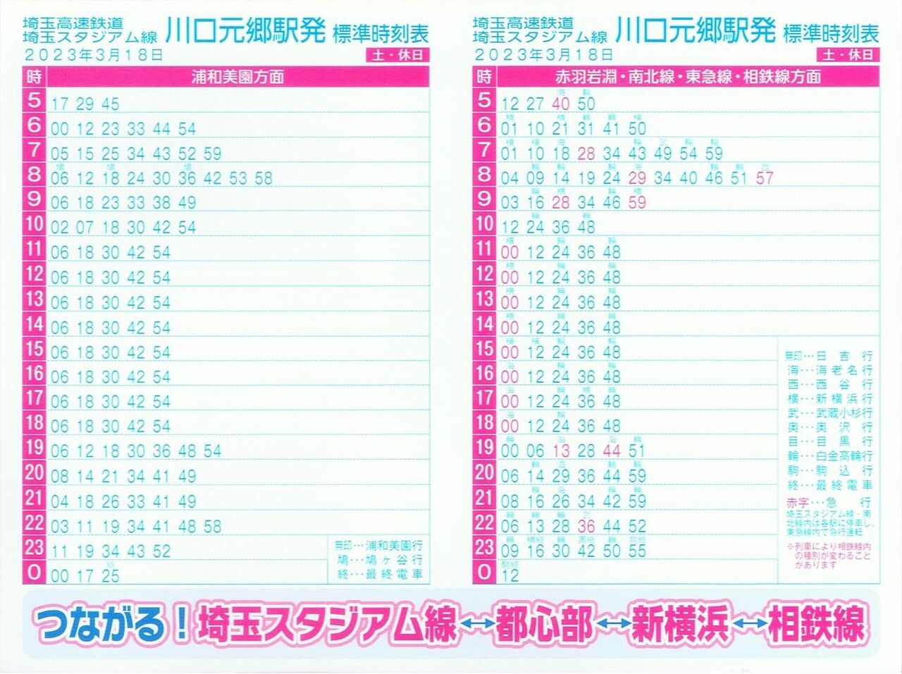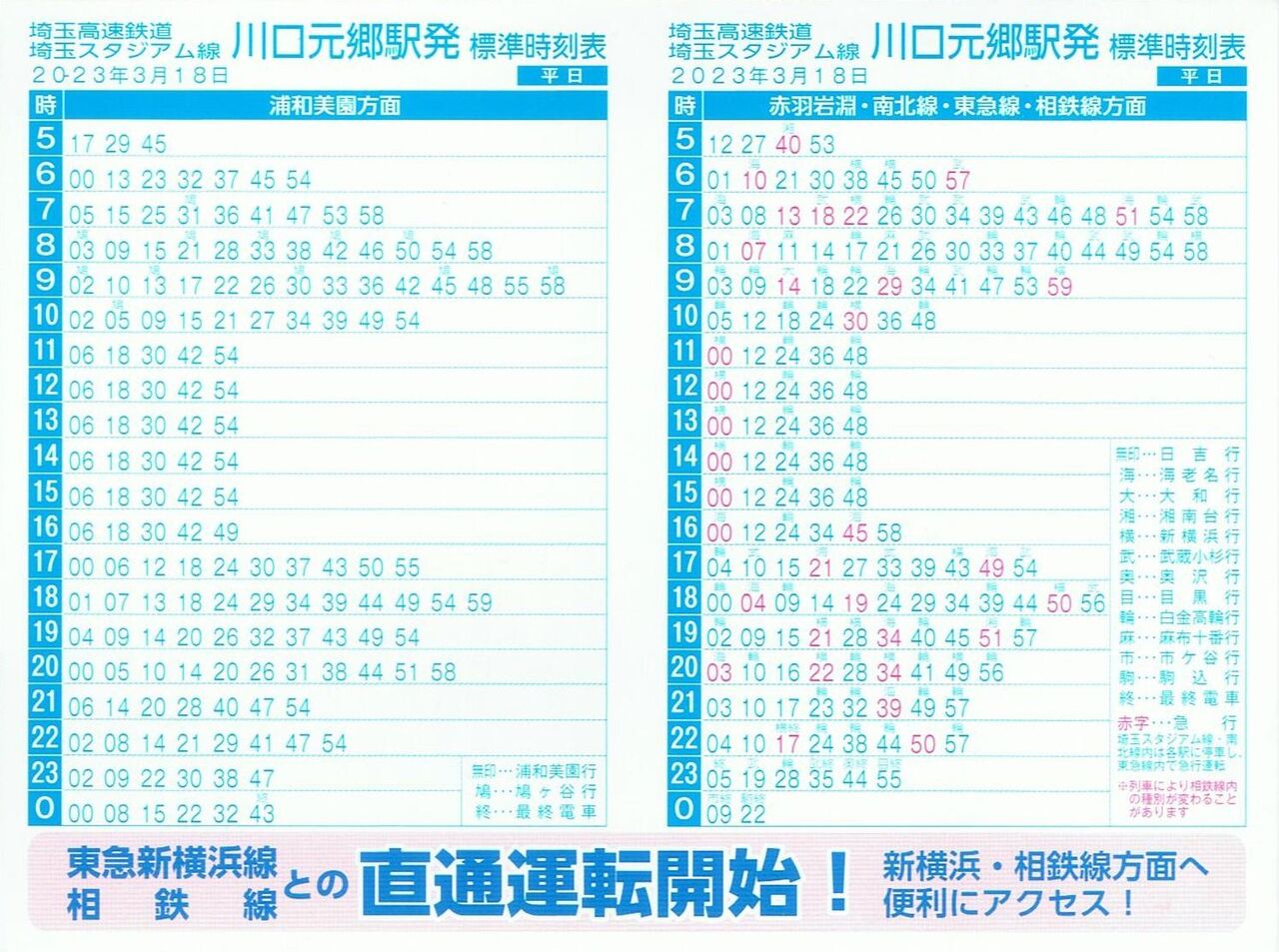 赤羽岩淵駅以外の埼玉高速鉄道各駅で配布されていたポケット時刻表の表面(平日)と裏面(土・休日)です。こちらの路線は愛称の『埼玉スタジアム線』と記載されています。下部に東急新横浜線、相鉄線との直通運転開始をPR。これに気づかなければ記念乗車券だけ購入して直ぐに帰っていたでしょう。しっかり各駅分を収集してきました。