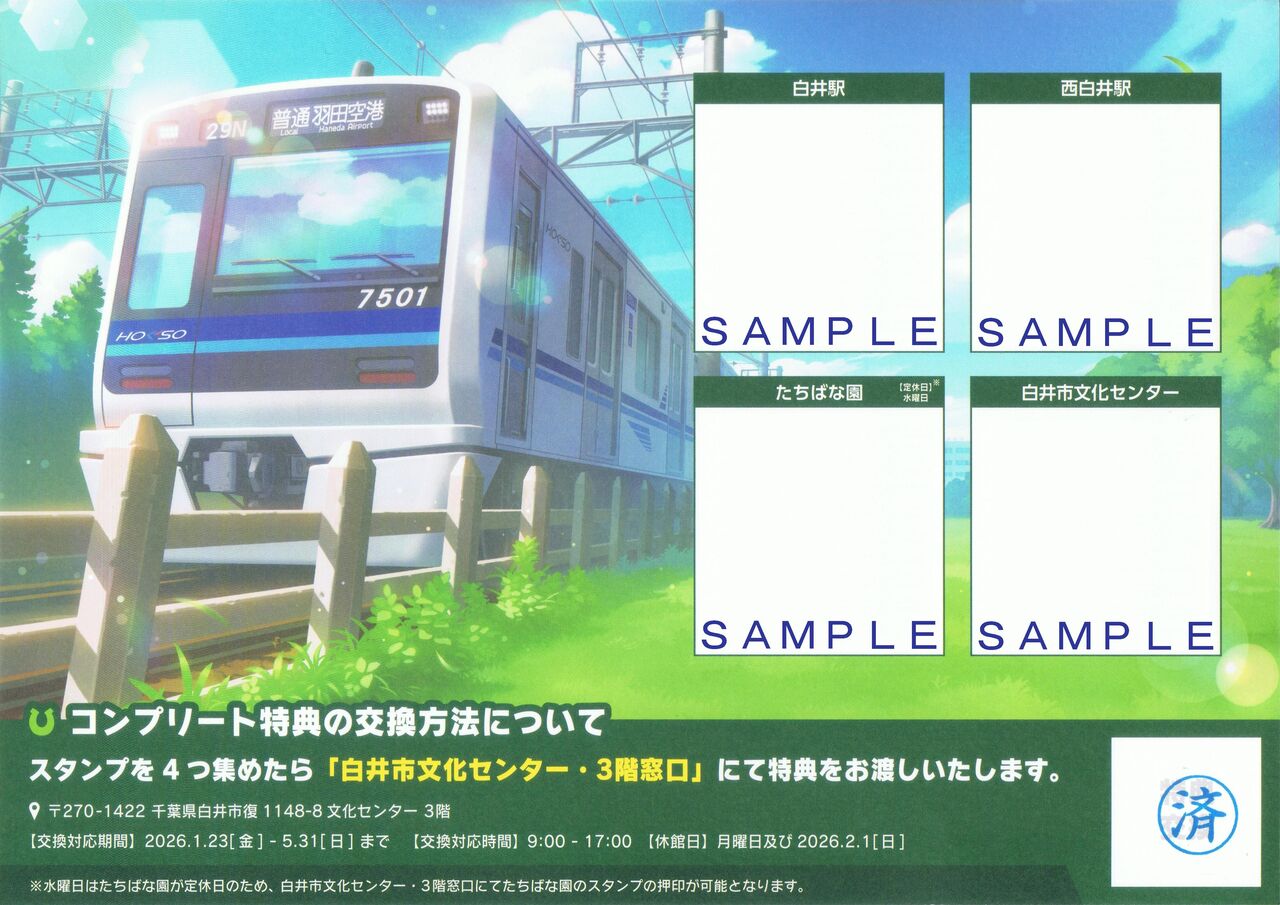 左はたちばな園。右は白井市文化センター。全4種類のスタンプを押したスタンプラリー台紙を白井市文化センター3階窓口にて提示するとA3サイズのクリアポスターがプレゼントされます。======================================