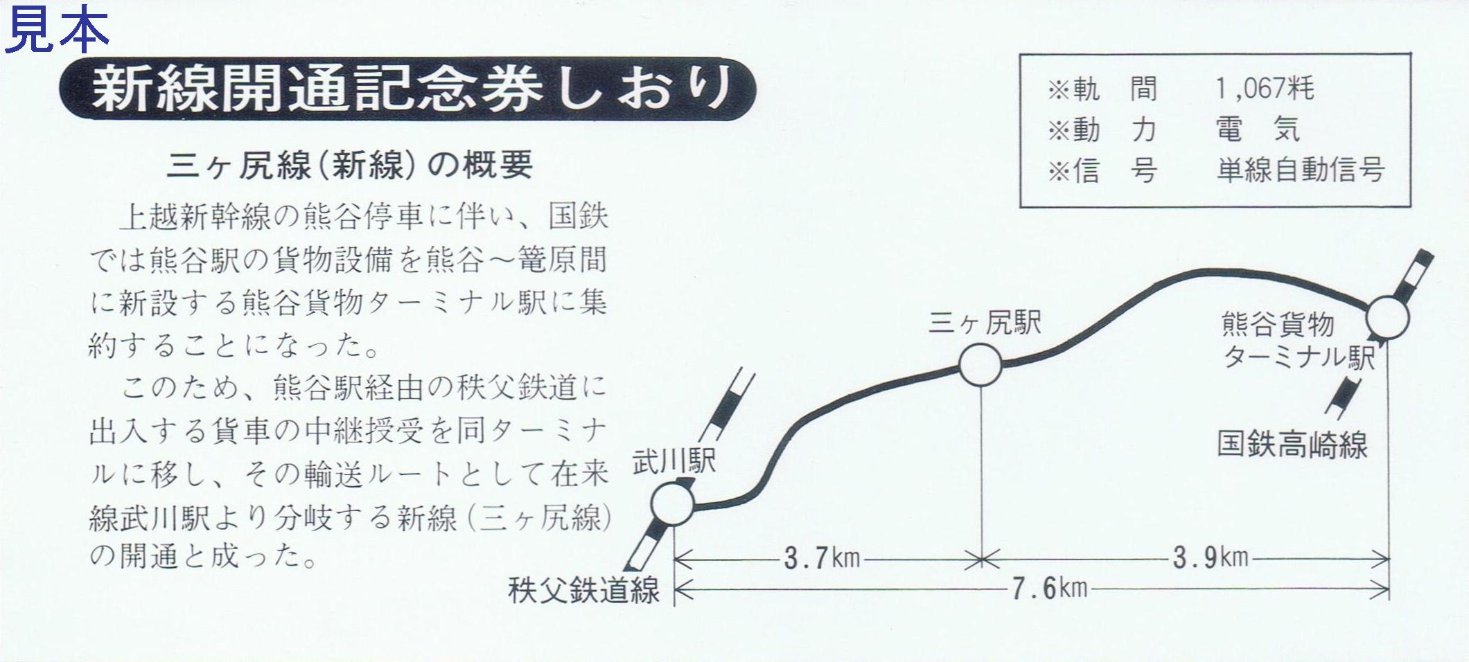 上越新幹線熊谷駅開設に伴う同駅の貨物設備の熊谷貨物ターミナル駅への集約に伴い開業した三ヶ尻線の新線開業を記念した乗車券。袋(写真)と乗車券2枚、記念しおり1枚のセットです。