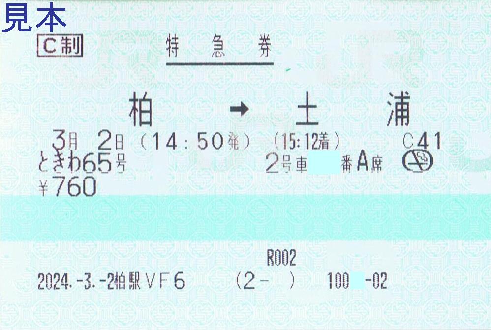 《柏駅VF6発行 ときわ65号 特急券(2024年(令和6年)3月2日)》