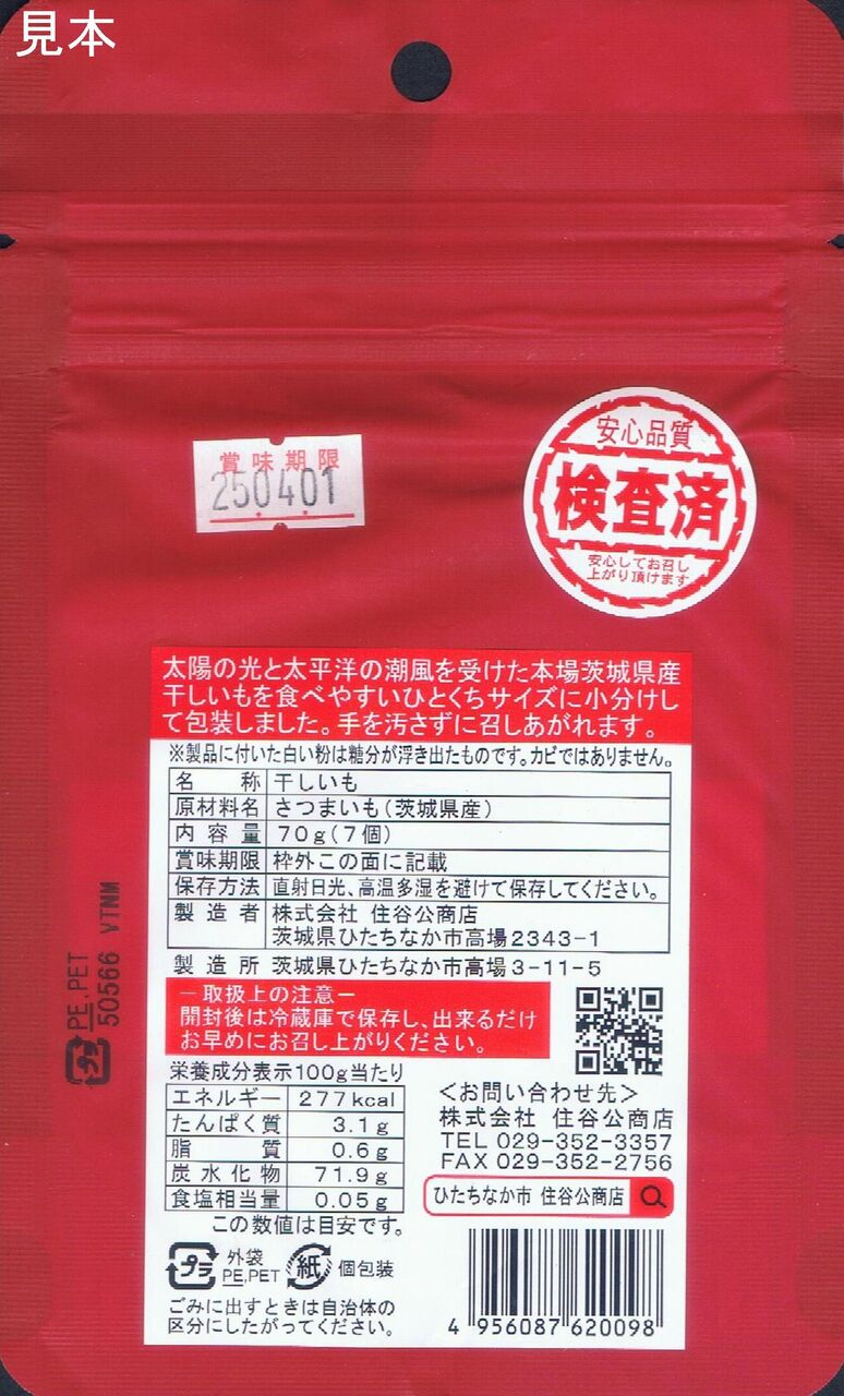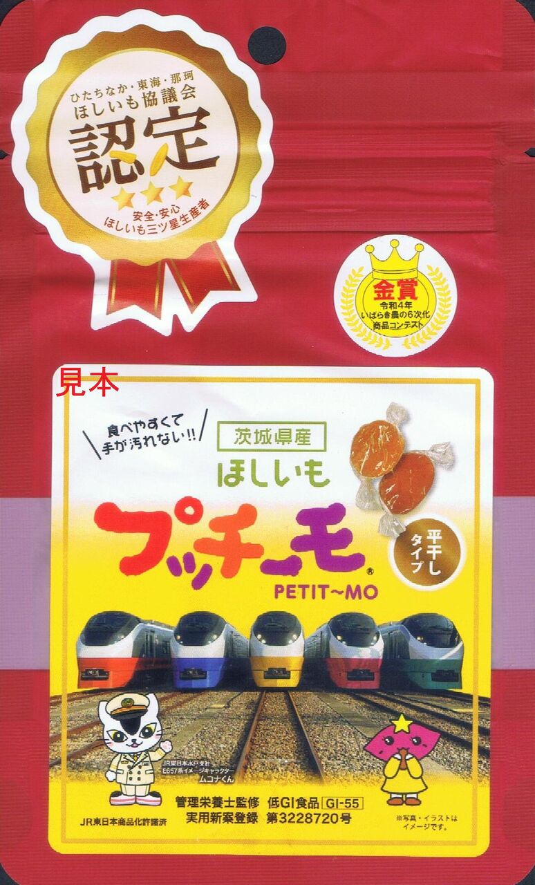 主に常磐線特急ひたち号車内販売で発売中のリバイバルカラー車両パッケージに入った一口サイズの干し芋。税込670円。写真左はパッケージ表面。右は裏面です。私は特急ひたち号車内販売で購入後、あまりの美味しさに感動し、もう1個買おうと思ったら車内販売終了で買えず。残念に思っていたところ、下車した偕楽園駅ホーム上の100周年グッズ販売会場でも取り扱い。そこで再購入しました。小さく個包装されていますが、個体差があり、透明感のある色のものは特に甘みが強くて美味しかったです。======================================