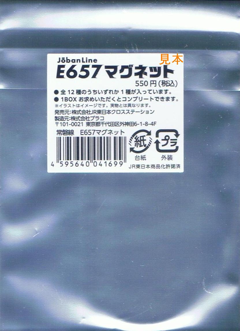 E657リバイバルカラー登場記念(第2弾)としてNEWDAYS上野中央口店で販売されている商品のひとつ。税込550円。ブラインド販売で写真左の袋に入っています。私が購入したものの中身は橙色車両のシンボルマーク『袋田の滝と紅葉』のマグネット(写真右)でした。