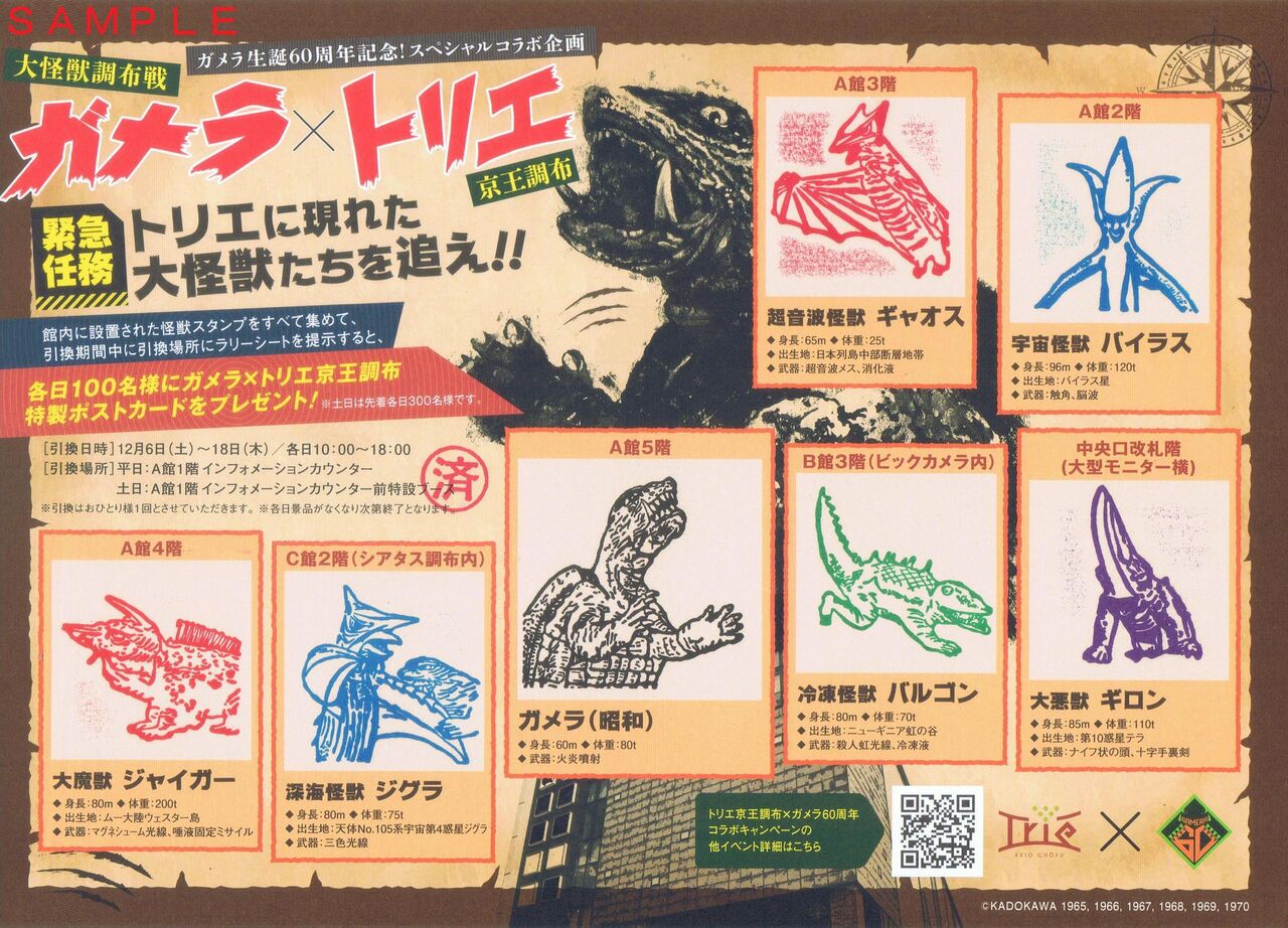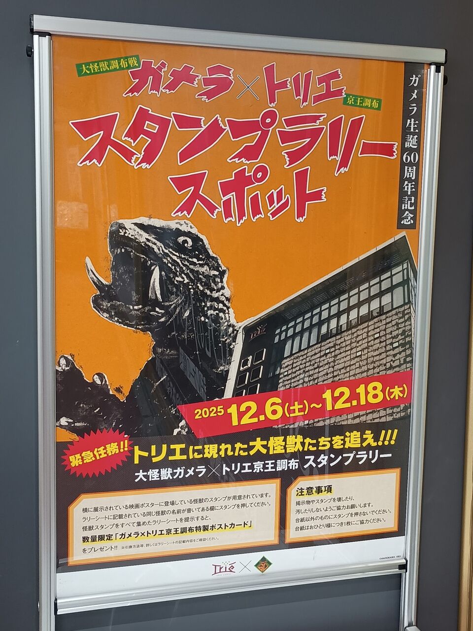 京王グループと角川大映はガメラ生誕60周年を記念して2025(令和7)年12月にコラボレーション企画を実施しています(一部は終了)。京王電鉄では京王8000系電車・1編成にヘッドマークを装着した『ガメラトレイン』を運行(同月1〜25日予定)。調布駅の商業施設『トリエ調布』では『怪獣スタンプラリー』の開催(同月6〜18日実施)およびイオンシネマシアタス調布にて『昭和ガメラ映画祭』を開催しました。