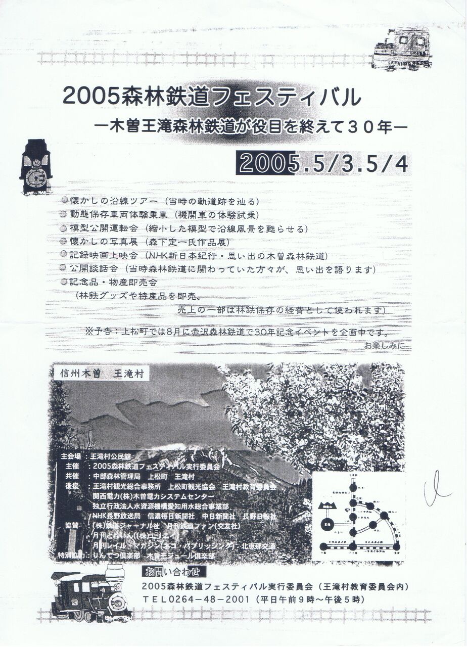 王滝村としては森林鉄道でもっと観光客を呼び込みたいところかもしれませんが、『自然』や『いのぶた料理』で呼び込んでみる事も可能と思います。かわりに村でも森林鉄道グッズを作ってみてはいかがでしょうか(先述のどんぐりぱんややまばと号図面が良かったので)。グッズとしては村所有の車両や資料を活かして(他の保存鉄道でも意外とありそうで少ない)絵はがきやテレホンカードをシリーズ化して時間をかけて多種類(不良在庫を抱えぬ程度に)発行しても良いかと思います。フェスティバル会場だけでなく通販をやってみたり、最強の販売手段(!?)としてナローゲージを扱う模型店や神田神保町の書泉グランデ(←本屋なのに意外と鉄道関連グッズが充実している)などで売っていたりすると、森林鉄道を知っている人は即買い、そうでない人もグッズだけでなく実車に興味を示し来村されるのでは?逆に村に来ないと買えないものも作ってみたりする方法もあるかと…(実は公民館会場で売っていた森林鉄道ワインも欲しかったのですが、その後も旅行を続ける為に買わなかったので、通販があると助かります。)