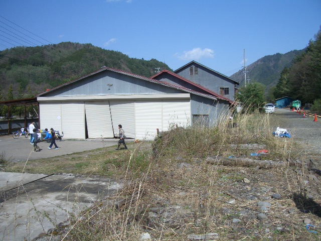 おんたけ交通バス滝越線で滝越往復後、王滝バス停(以下、バス停)で下車します。現在の王滝村の中心はこのバス停周辺ですが、旧王滝森林鉄道では対岸に位置する田島停車場が王滝村の中心駅だったようです。今回の森林鉄道フェスティバルでの写真展示・模型運転会・物品販売はバス停前の公民館で、体験乗車は田島停車場跡地(以下、田島会場)で行われます。先に田島会場まで徒歩で移動します。バス停付近が高台に位置するため、対岸の低いところにある田島会場は初めての訪問者でもすぐにわかります。田島会場の方から森林鉄道の車両から鳴らされる警笛らしき音が聞こえてきます。