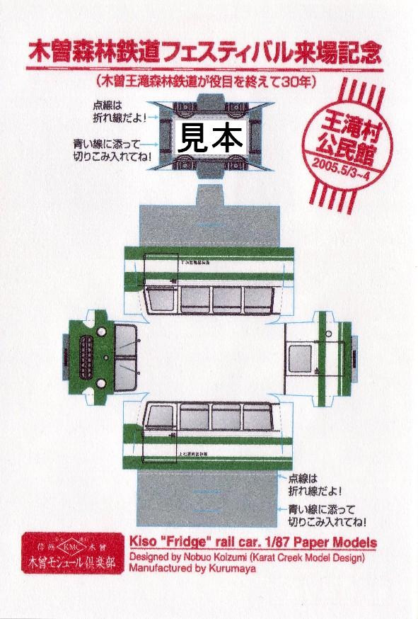 2005森林鉄道フェスティバル王滝公民館会場で鉄道模型運転会を行っていた木曾モジュール倶楽部特製の記念カードは、絵はがき大の用紙にモーターカーの展開図が印刷されたペーパークラフトになっています。うれしいお土産です。
