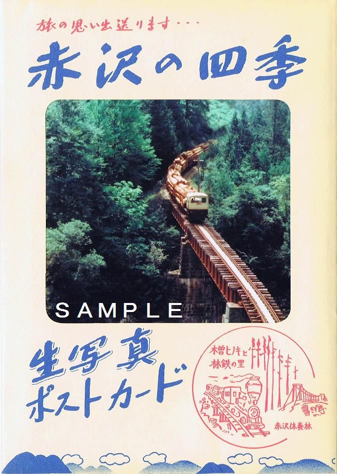平成23年8月12日に赤沢自然休養林内の食堂・売店「せせらぎの里赤沢」のレジで発売しており、6枚セット袋入りで税込900円。6枚中1枚のみ小川森林鉄道現役時代の写真。その他は植物の写真です。