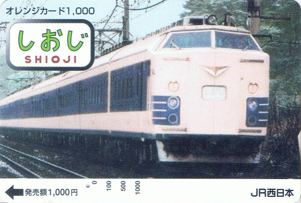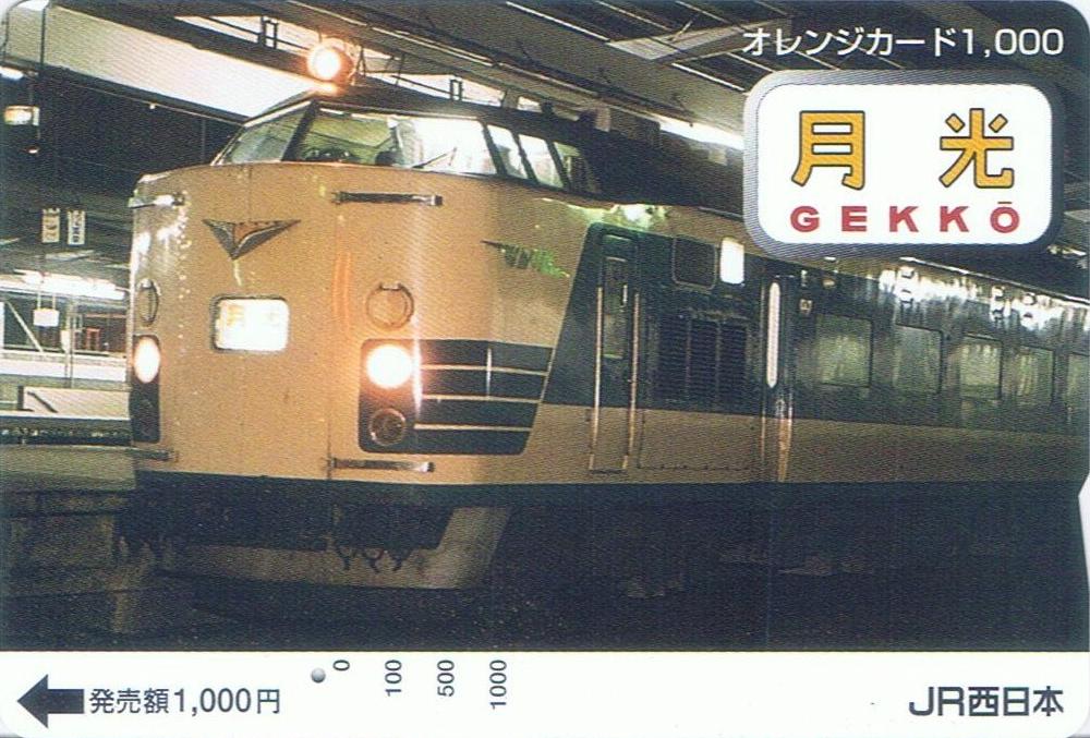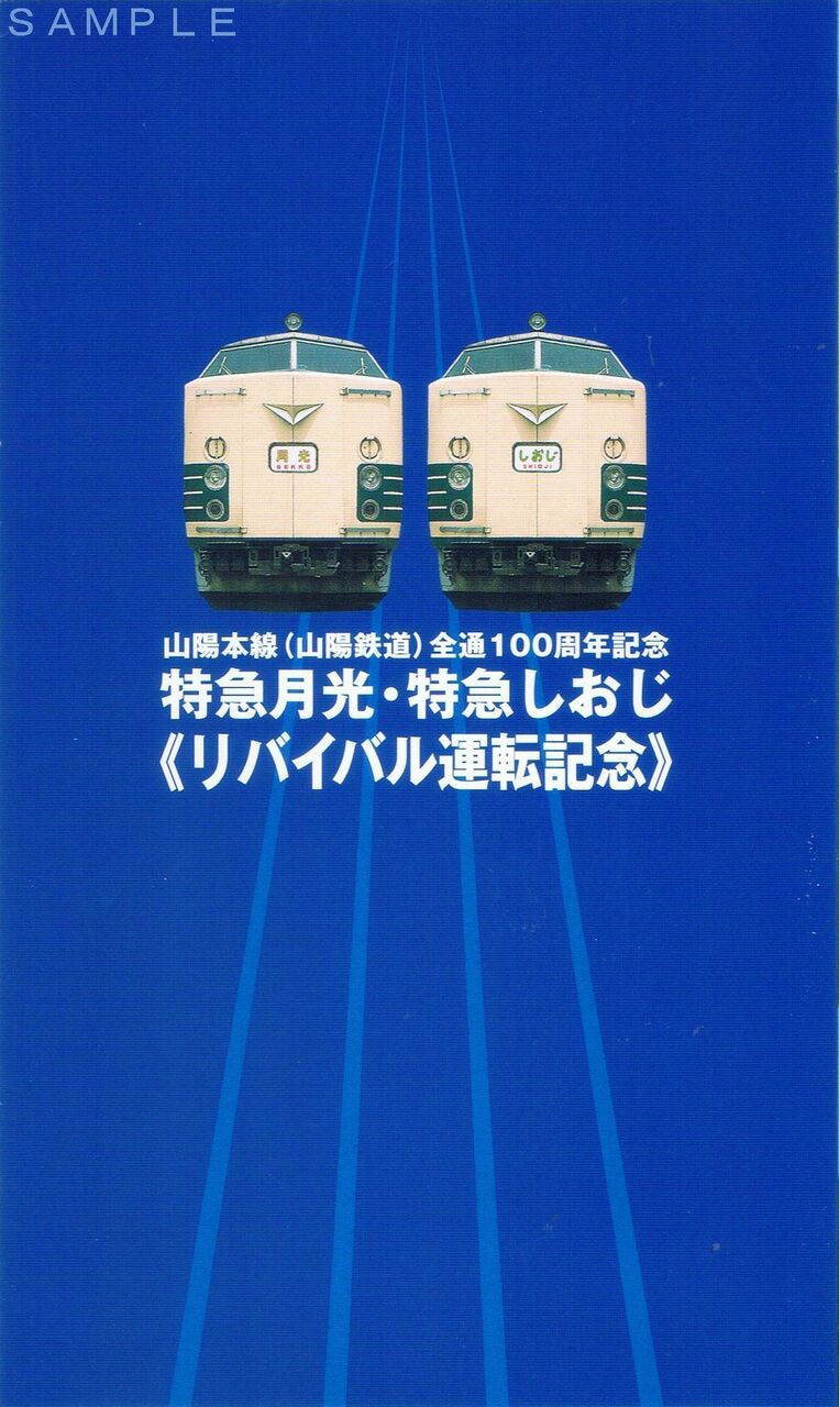 JR西日本は山陽鉄道(現・山陽本線)の全通100周年を記念して、JR東日本所属の583系を使用したリバイバルトレイン『特急月光号』(2001年7月28〜29日)、『特急しおじ号』(同年7月30日)を運行(新大阪〜下関間)。写真はその記念で発行されたオレンジカードです。