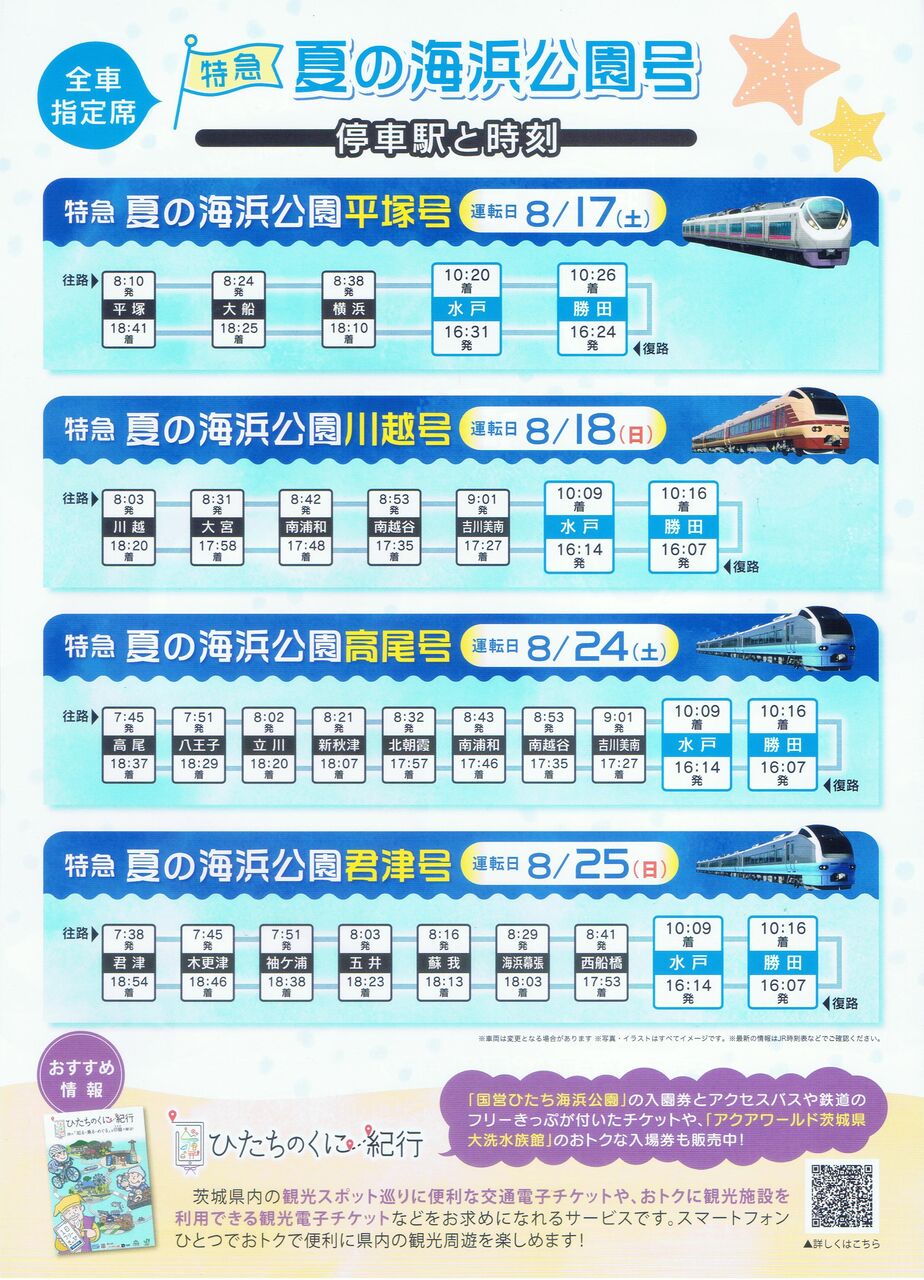 E657系を使用した『夏の海浜公園平塚号』、E653系・K70編成(国鉄色)を使用した『夏の海浜公園川越号』、653系(かつての常磐線特急「フレッシュひたち」のカラーリングをベースとした塗色としてバリエーションを持たせた水色のK71編成)を使用した『夏の海浜公園高尾号』『夏の海浜公園君津号』に関するリーフレットの表面と裏面です。