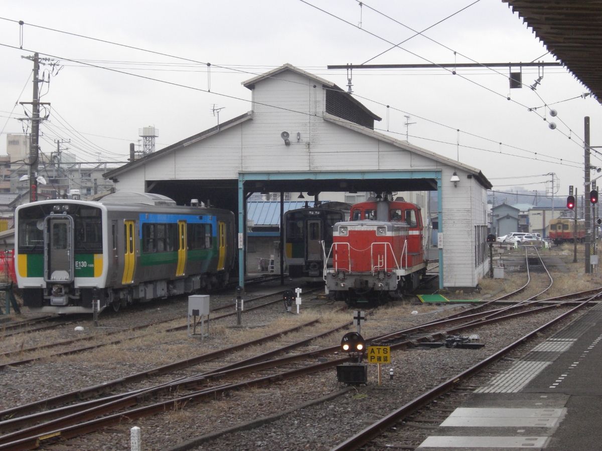 写真左は幕張車両センター木更津派出。中央にはDE10-1202ディーゼル機関車。右奥には引退したキハ30形国鉄色が留置されています。